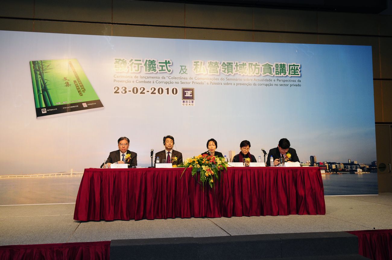 此外,發行儀式後,隨即進行「私營領域防貪講座」,由澳門廉政公署助理專員杜慧芳主持,主講嘉賓包括:國家預防腐敗局辦公室副主任于賢成、香港廉政公署社區關係處處長穆斐文、香港中華廠商聯合會會長黃友嘉、澳門大學副校長何順文教授。