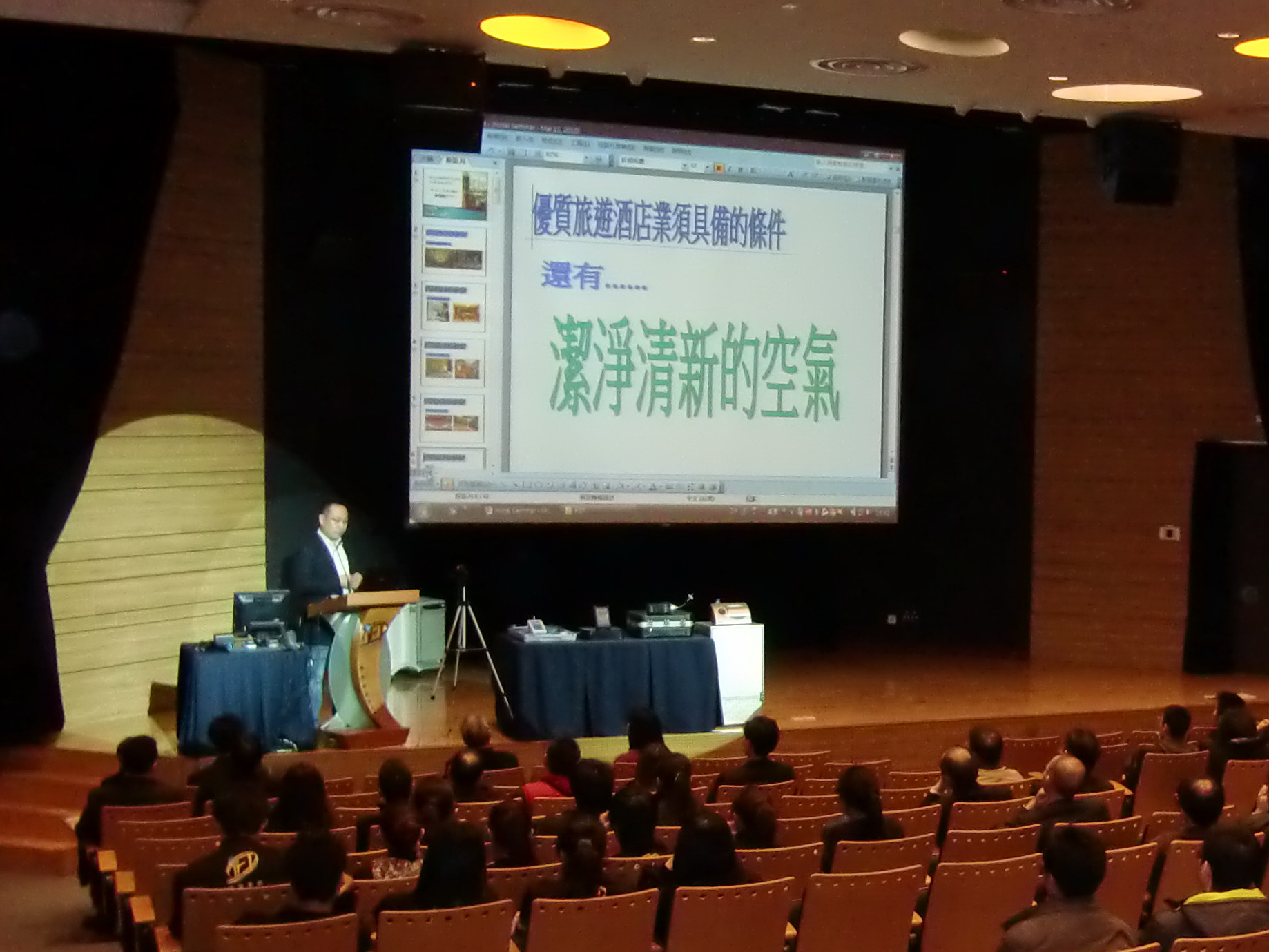 隨著旅遊服務業的發展,多所大型娛樂酒店相繼投入運作,旅客人數持逐增加,場所內的空氣質素備受關注。為此,旅遊學院特別於2010年3月11日舉辦名為「酒店娛樂場空氣淨化技術及其應用」的公開講座,邀請香港室內空氣淨化專家黃勁松先生蒞澳主講。