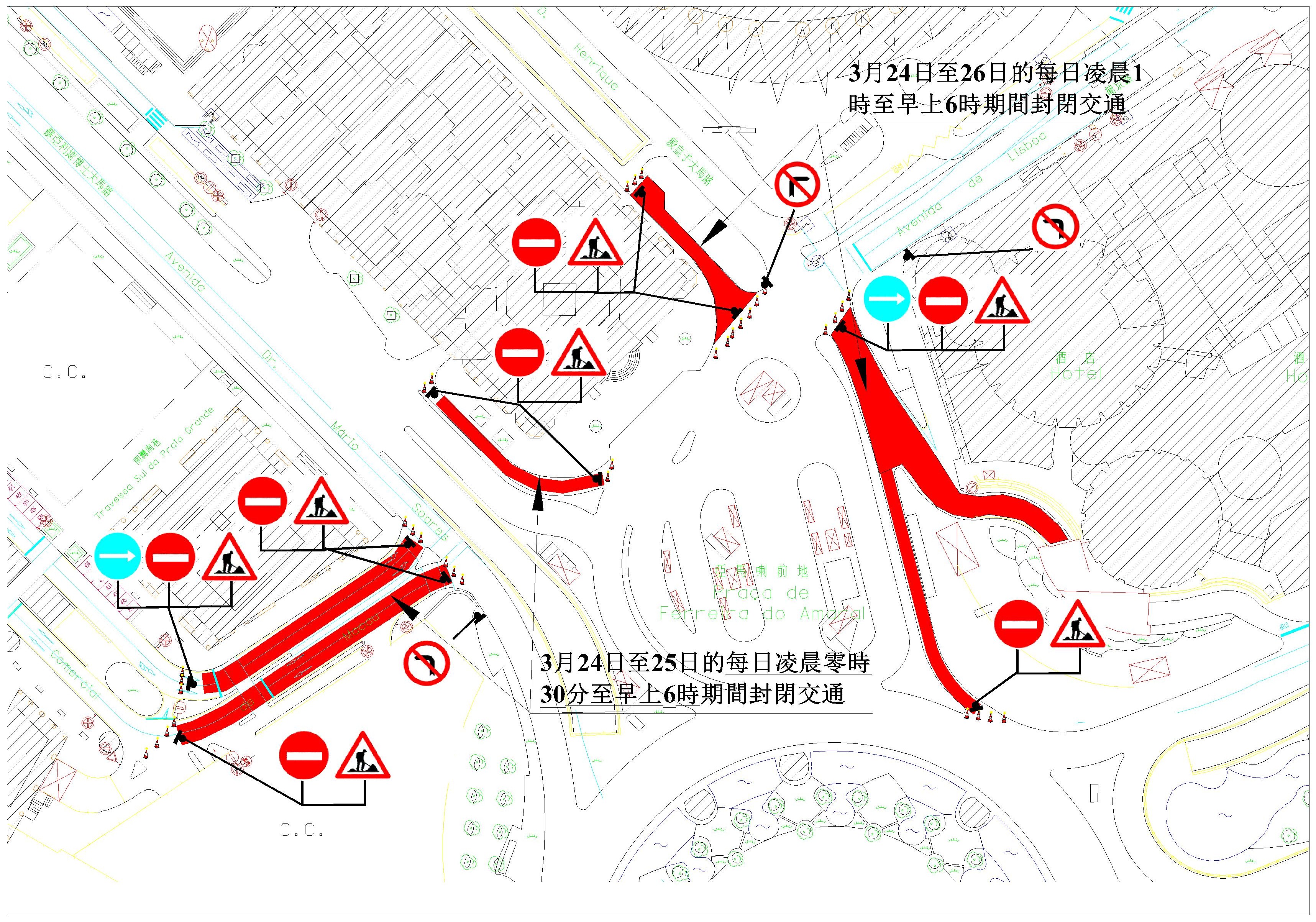 因進行重鋪路面工程,近亞馬喇前地的多條路段,包括商業大馬路及蘇亞利斯博士大馬路等,將於周三(24日)起實施交通管制措施,交通事務局呼籲駕駛者留意有關交通改動。