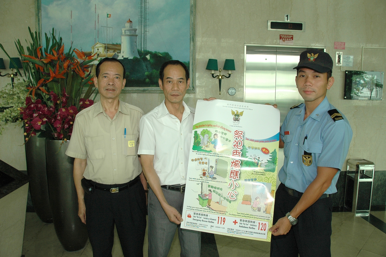 另外,在秋季期間天氣會漸漸變得乾燥,若不小心注意火種,造成火災的機會亦相應增加;故此,消防局呼籲全澳市民及樓宇的管理機構,注意樓宇內消防系統、設施及設備的保養,保確其運作正常;樓宇之公共通道及走火通道,不應擺放雜物,以免在發生火災時造成阻塞,影響逃生安全;而且樓宇內之防煙門要經常關閉,以免影響其阻隔濃煙及火警漫延的效能;最後提醒市民,發生火警時切勿使用電梯逃生。