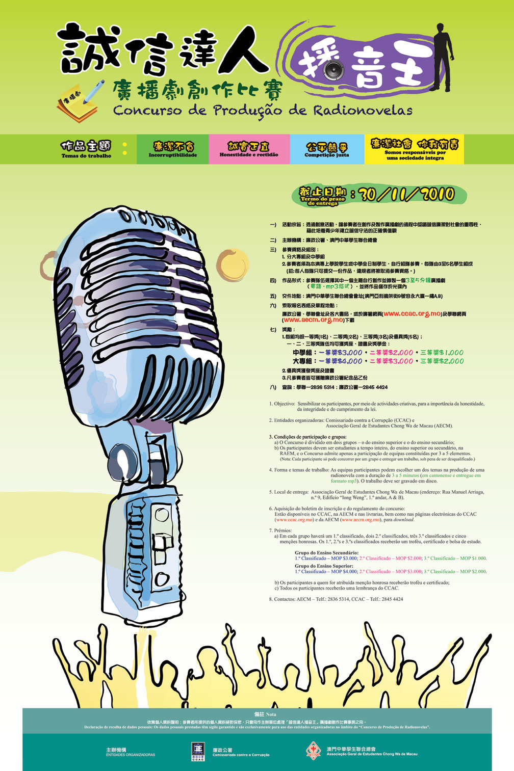 是次比賽的目的是透過創意活動,讓參賽者在創作廣播劇的過程中,認識誠信廉潔對社會的重要性,藉此培養青少年建立誠信守法的正確價值觀。比賽分大專組及中學組,參加者須為本澳專上學院學生或中學全日制學生,以3至5人隊制參賽,截止報名及交件日期為2010年11月30日。