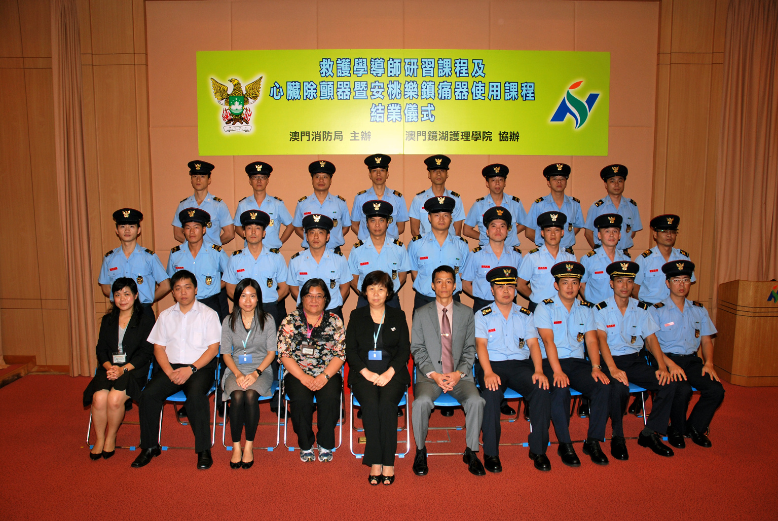 由消防局及鏡湖護理學院合作開辦之2010年度《救護學導師研習課程》,以及《自動體外心臟除顫器暨安桃樂鎮痛器使用課程》,於10月26日下午四時在鏡湖護理學院舉行了結業儀式,儀式由消防局資源管理廳代廳長呂照耀副消防總長及鏡湖護理學院邢志紅院長助理擔任主禮嘉賓,並頒發了奬狀及結業證書。