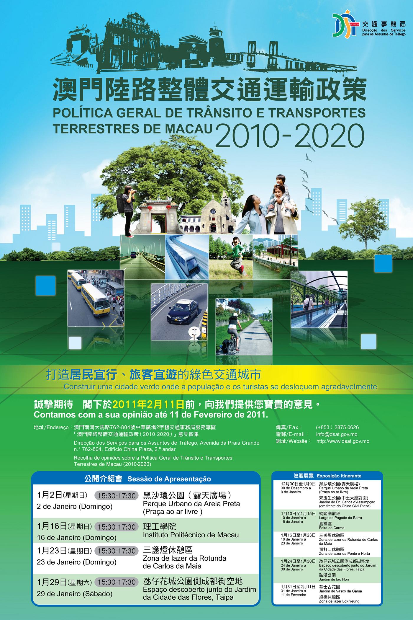 「澳門陸路整體交通運輸政策(2010-2020)」第二階段意見徵集已經啟動,期間將舉行巡迴展覽及四場公開介紹會,首場公開介紹會定於明天(2日)下午3時30分在黑沙環公園舉行,期望公眾踴躍參加和即場提出建議。