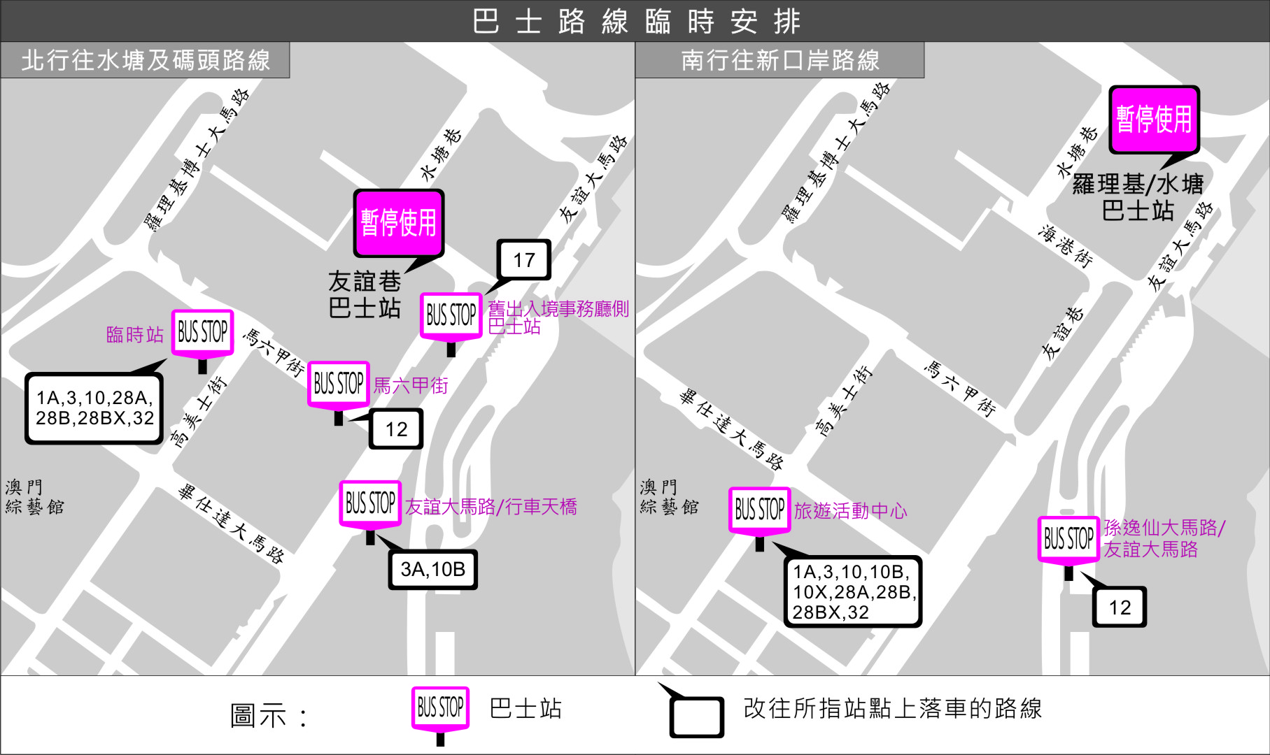 同時,“友誼巷”站亦暫停使用,多條路線需作繞道:北行往水塘及外港碼頭方向的1A、3、10、28A、28B、28BX及32路線在停靠“理工學院”站後,改於高美士街近馬六甲街停車場的臨時巴士站停靠;12路線及17路線在停靠“孫逸仙大馬路/金沙”站後,12路線改停靠“馬六甲街”站,17路線改停靠友誼大馬路舊出入出入境事務廳側的巴士站。搭乘3A及10B路線的乘客則請改往“友誼馬路/行車天橋”站上落車。