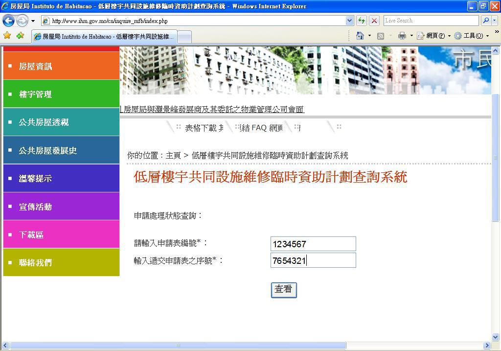 爲進一步提供更方便、快捷的便民服務,房屋局於本月起新增《低層樓宇共同設施維修臨時資助計劃》網上查詢系統,市民可透過登入房屋局網頁(www.ihm.gov.mo)利用該新系統查閱有關申請狀況。