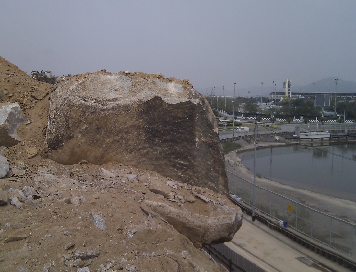 鑑於近日爆破的範圍較接近外圍道路,以致部分砂石滑落九澳高頂馬路;土地工務運輸局為此事前已聯同相關部門將涉及的高頂馬路封閉,並在爆破後督促施工單位加緊清理現場。施工單位於前天(4月27日)已將現場清理,但其後發現有一約4米乘4米的巨石仍懸吊在毗鄰高頂馬路的山坡上,當中更有一半凸出山坡以外;經土地工務運輸局駐場人員評估後,考慮到公眾安全,決定再以控制爆破方式將巨石解體,並延長九澳高頂馬路的封閉時間,以確保施工安全。
