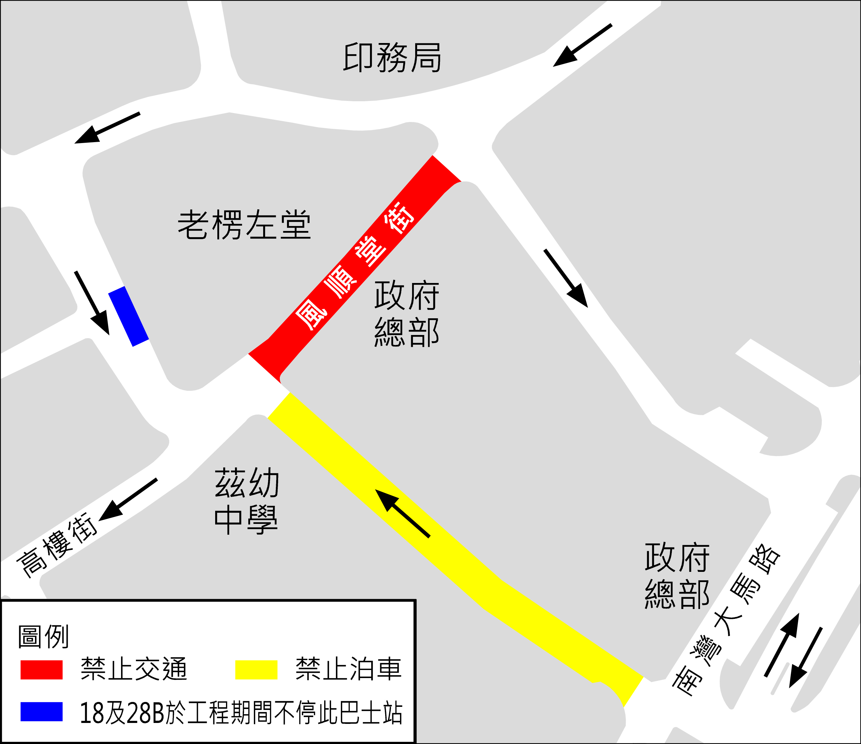 另外,介乎卑第巷與擺華巷之間的一段風順堂街,亦將於本月4日及18日早上9時30分至下午4時封閉交通,以進行起卸及搬運冷氣工作,期間,相關路段只允許工程車輛停泊及上落貨,而18及28B巴士路線將暫時不經風順堂街之巴士站。