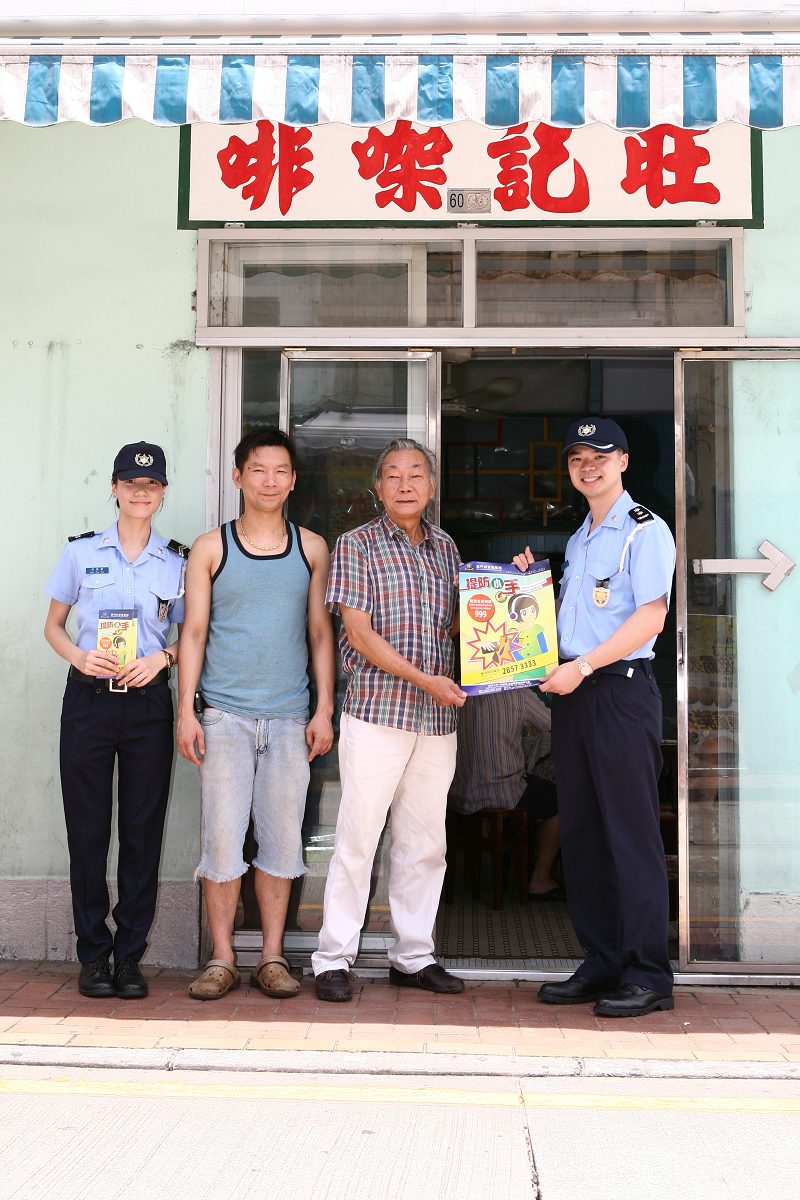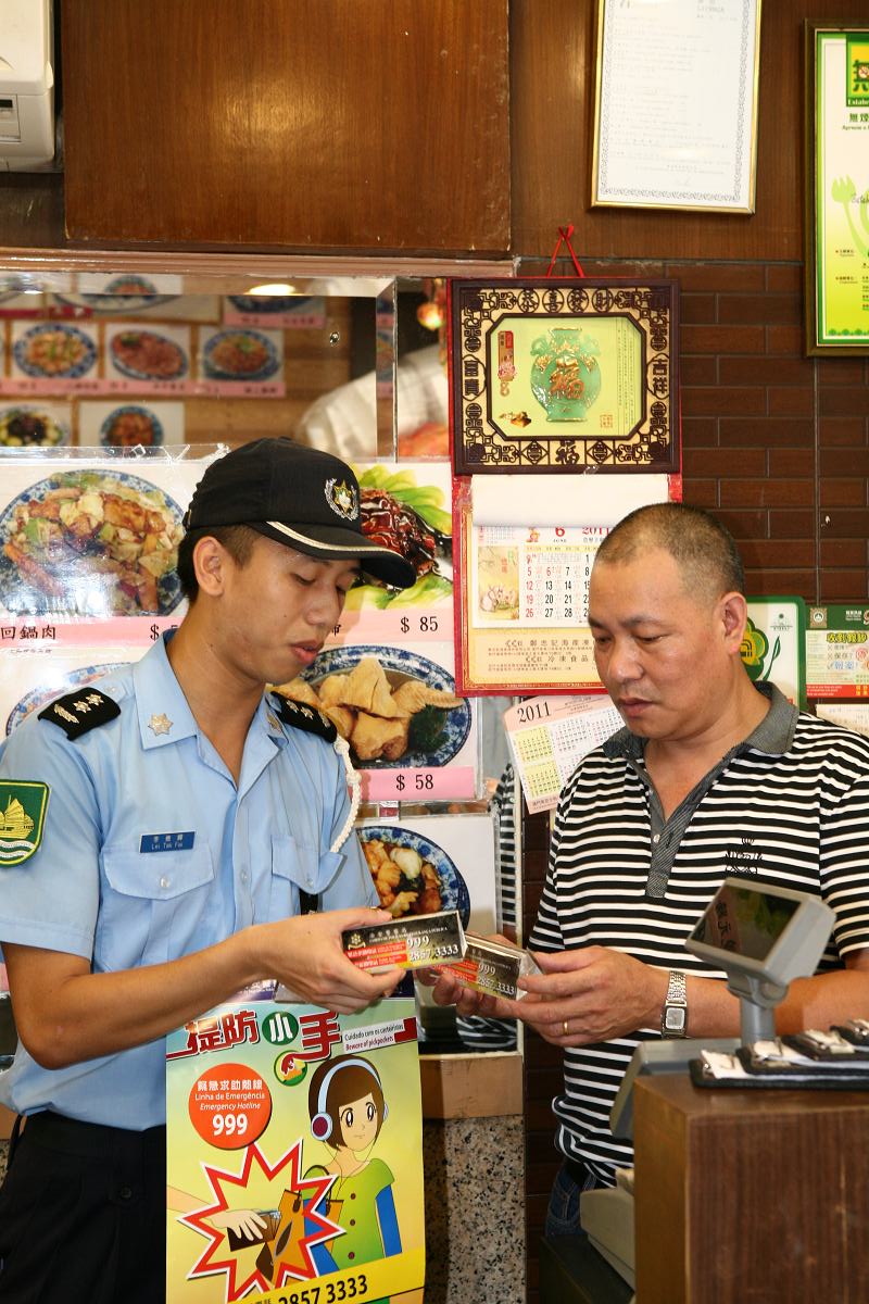 今天早上11時正,本局公共關係處源劍鋒副警司及劉國熙副警司、連同氹仔警務警司處李德輝副警司到官也街一帶食肆及手信店進行防扒竊宣傳工作,向遊客及居民派發“提防小手”小冊子、講解常見的扒竊手法、提醒注意自身財物的安全,呼籲遊客在有需要時應報警求助,以免讓不法份子消遙法外;另外,亦得到附近商鋪負責人的支持,在多間食肆及手信店內張貼“提防小手”海報,提高防罪意識,並即場對財物外露的店鋪顧客作出溫馨提示,讓其了解正確的保管財物方法。其後,宣傳小組人員分別移師南新花園及雍景灣對開巴士站繼續進行宣傳活動,提醒居民及遊客在乘車或候車期間應注意自身財物的安全,有需要可報警求助。