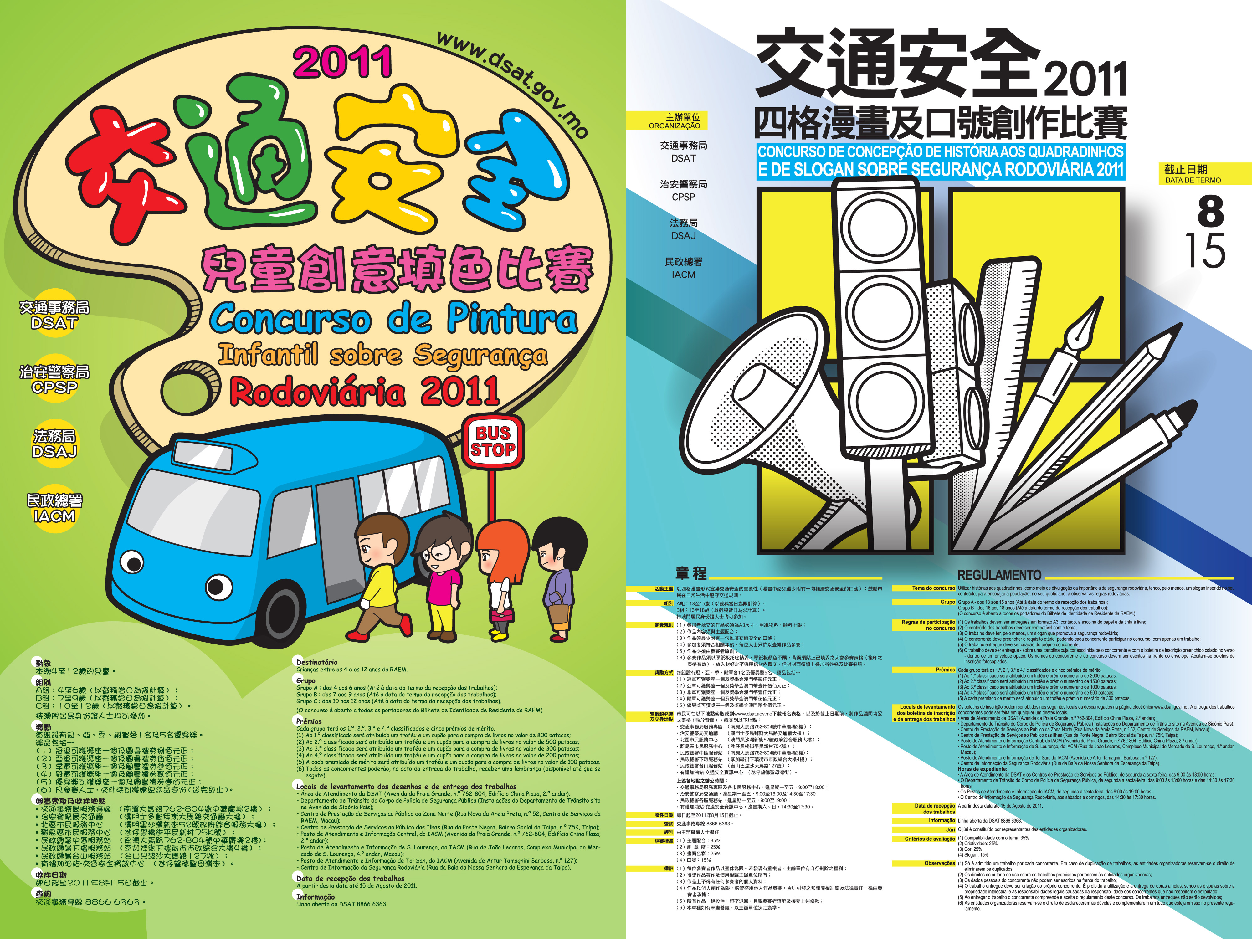 為宣揚交通安全訊息,交通事務局、治安警察局、法務局及民政總署今年繼續舉辦“交通安全兒童創意填色比賽",同時首次舉辦“交通安全四格漫畫及口號創作比賽",兩項比賽均由即日起接受報名,截止日期為8月15日,歡迎4至18歲的兒童及青少年報名參加。
