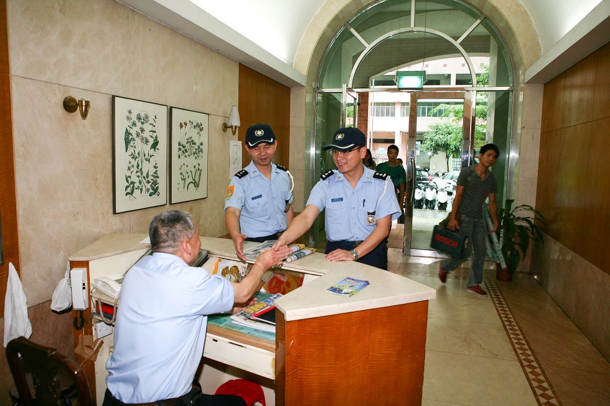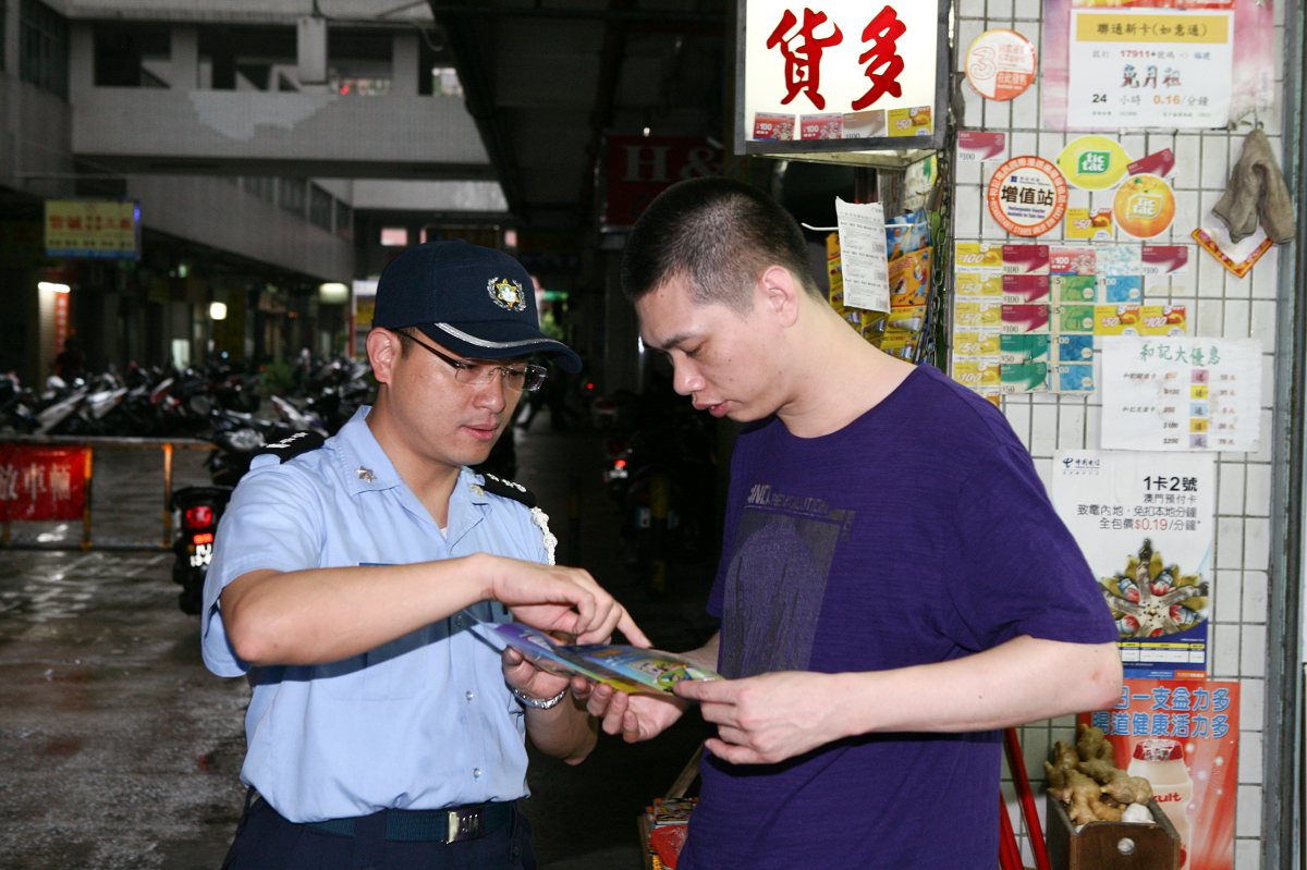 今天上午,本局公共關係處副警司黃超文及澳門警務廳副警司陳溥棠到澳門東北區保利達花園及廣福祥花園進行大廈滅罪宣傳工作,向居民派發“慎防門戶保安全”小及“舉報不法.全民有責”小冊子,講解常見大廈犯罪情況,提醒注意家居安全,同時暑期外出旅遊時須注意加強防盜措施;呼籲住客守望相助,管理員及住客遇到犯罪及可疑情況應報警求助,勿讓不法份子消遙法外;宣傳亦得到大廈管理處及食肆的支持,在十多幢大廈及食店、商店內張貼宣傳海報,提高防罪意識。此外,亦對圍繞屋苑範圍的市民、行人等宣揚防治犯罪、警民合作的訊息。整項宣傳活動由11時開始至12時半左右結束。
