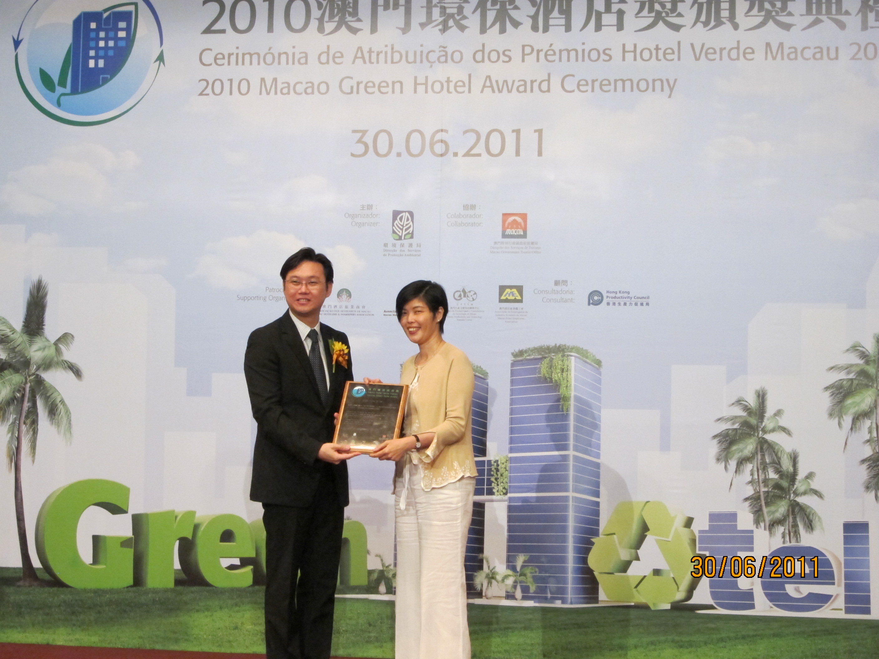 由環境保護局主辦、旅遊局協辦的2010「澳門環保酒店獎」得奬名單於早前揭曉,共有11間酒店獲獎,其中旅遊學院望廈迎賓館和澳門威斯汀度假酒店獲頒銀獎,其他9間酒店則獲頒銅獎。頒奬禮於6月30日假澳門世貿中心五樓蓮花廳舉行,邀請各得奬酒店代表參加,分享得奬的喜悅及交流環保心得。