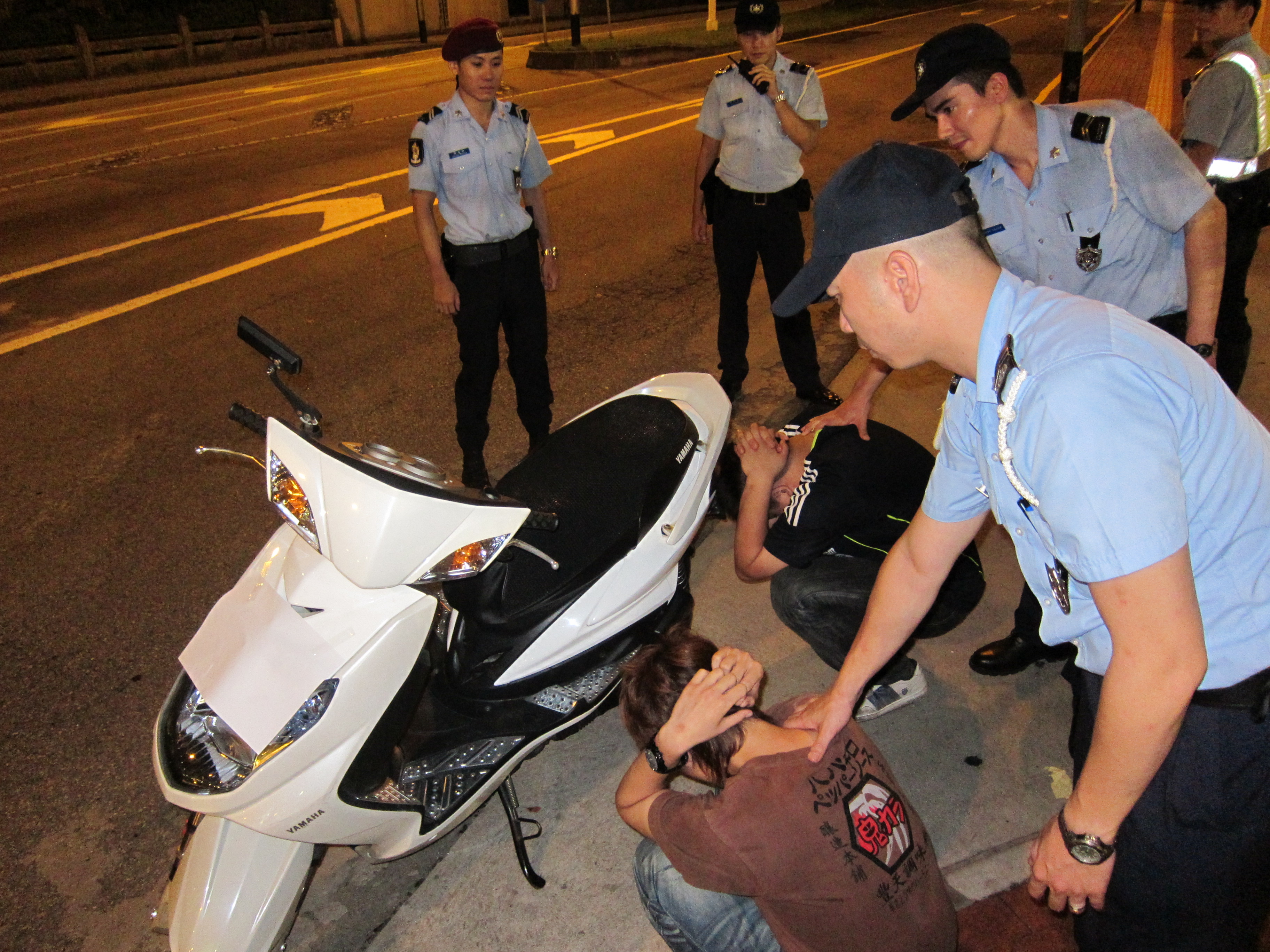 今天凌晨零時40分,治安警察局一巡邏小隊巡經關閘馬路與華大新邨第三街交界期間,發現一輛可疑的重型電單車駛經該處(車上載有司機及乘客),警員示意對方停車,並欲上前截查,惟該可疑電單車並未按警員指示停下來,反而加速離開。警員見狀立即尾隨追截該可欵電單車至巴波沙大馬路海南花園停車場入口處附近,成功截獲該可疑電單車及車上兩名疑人。兩疑人為澳門居民,姓崔的學生及姓劉的無業男子,年約20和22歲。追截期間,警員目睹其中一名疑人將手持的一個粉紅膠袋棄掉於上述車場閘門內,經警員搜查後發現該粉紅膠袋及電單車頭盔箱內藏有大量懷疑是麻醉或精神科藥物,包括: