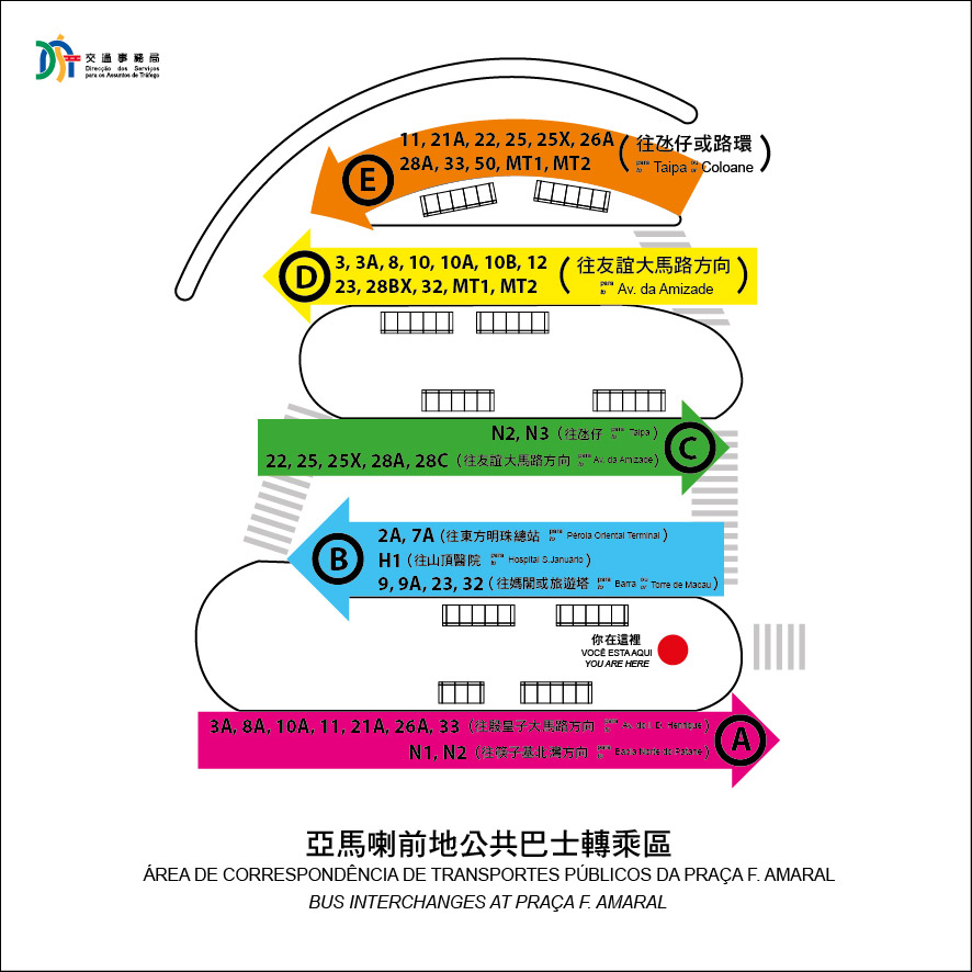 另外,因應上述路線調整,並配合部份路線於同日抽離約翰四世大馬路及殷皇子大馬路,途經「亞馬喇前地」站的巴士靠站位置將重新調整,為方便乘客知悉有關安排,交通事務局將於站內張貼新的巴士上落點位置圖,並安排巴士諮詢員在相關巴士站點,為乘客提供巴士路線諮詢服務,敬請乘客留意。