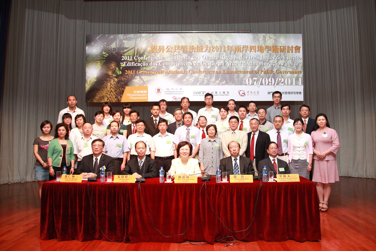 由行政暨公職局、澳門大學、台灣世新大學管理學院及澳門區域公共管理研究學會聯合主辦“提昇公共管治能力-2011兩岸四地學術研討會”於今(7)日在澳門大學成功召開。行政法務司陳麗敏司長、行政暨公職局朱偉幹局長、澳門大學趙偉校長、臺灣世新大學管理學院徐仁輝院長,以及澳門區域公共管理研究學會梁錦文監事長出席研討會開幕典禮。陳麗敏司長致開幕詞,並贈送紀念品予主講嘉賓及與多位參會學者合影留念。