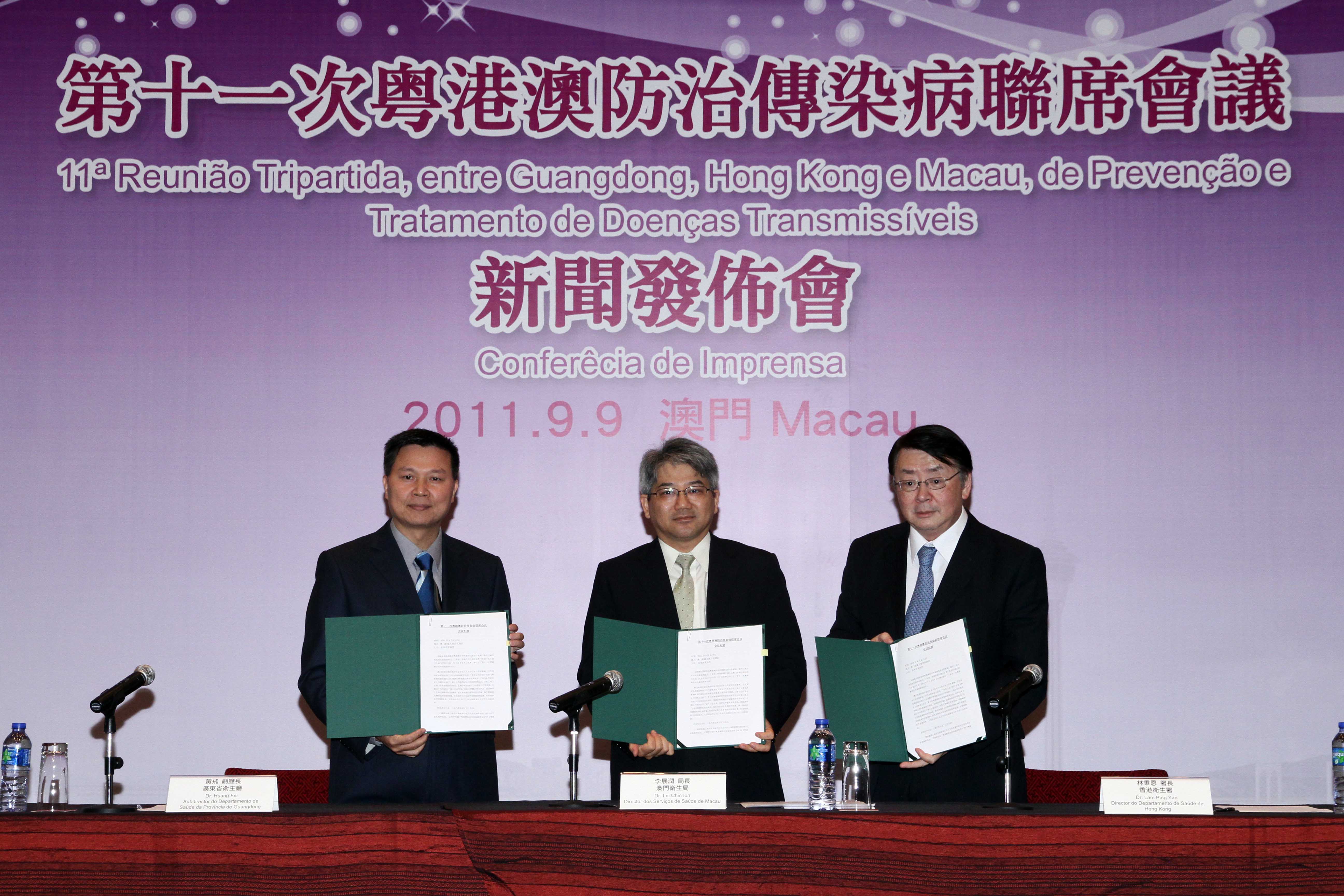 由特區政府衛生局舉辦的「第十一次粵港澳防治傳染病聯席會議」9月8日至9日一連兩日在澳門舉行,社會文化司司長辦公室張素梅主任,廣東省衛生廳黃飛副廳長和香港衛生署林秉恩署長等出席會議。