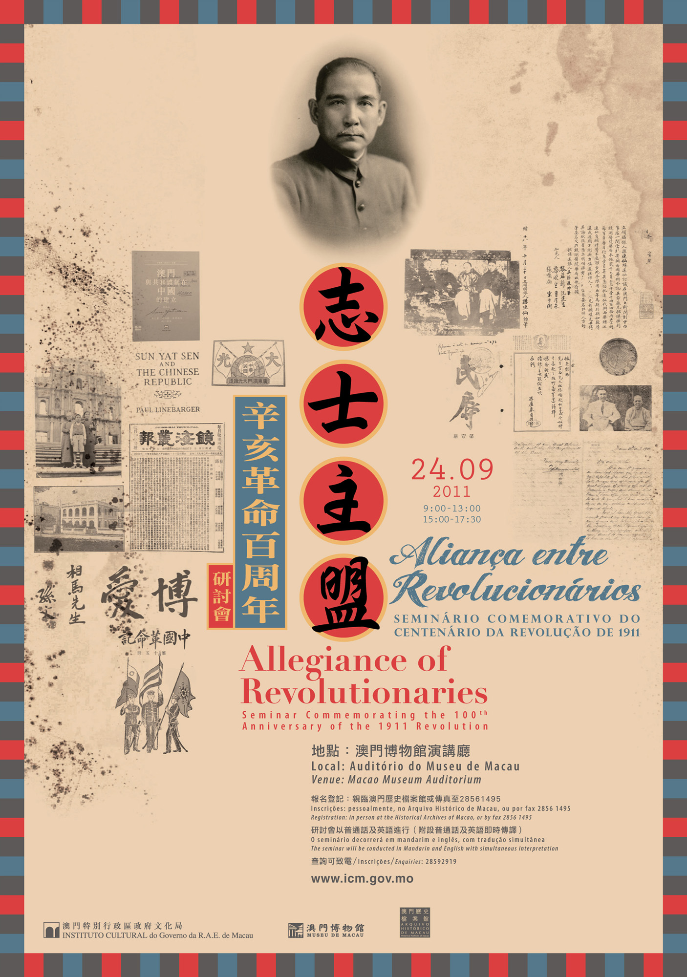 澳門文化局歷史檔案館將於本周六(九月二十四日)在澳門博物館演講廳舉辦「志士主盟:辛亥革命百周年研討會」。研討會上將有多位來自中港澳及外地的學者出席,發表以辛亥革命的背景、澳門在辛亥革命中的角色和辛亥革命的影響等為主題的論文,並邀得孫中山先生之孫女孫穗芳蒞臨擔任主講嘉賓,澳門大學社會科學及人文學院何偉傑教授擔任主持。歡迎公眾參與。
