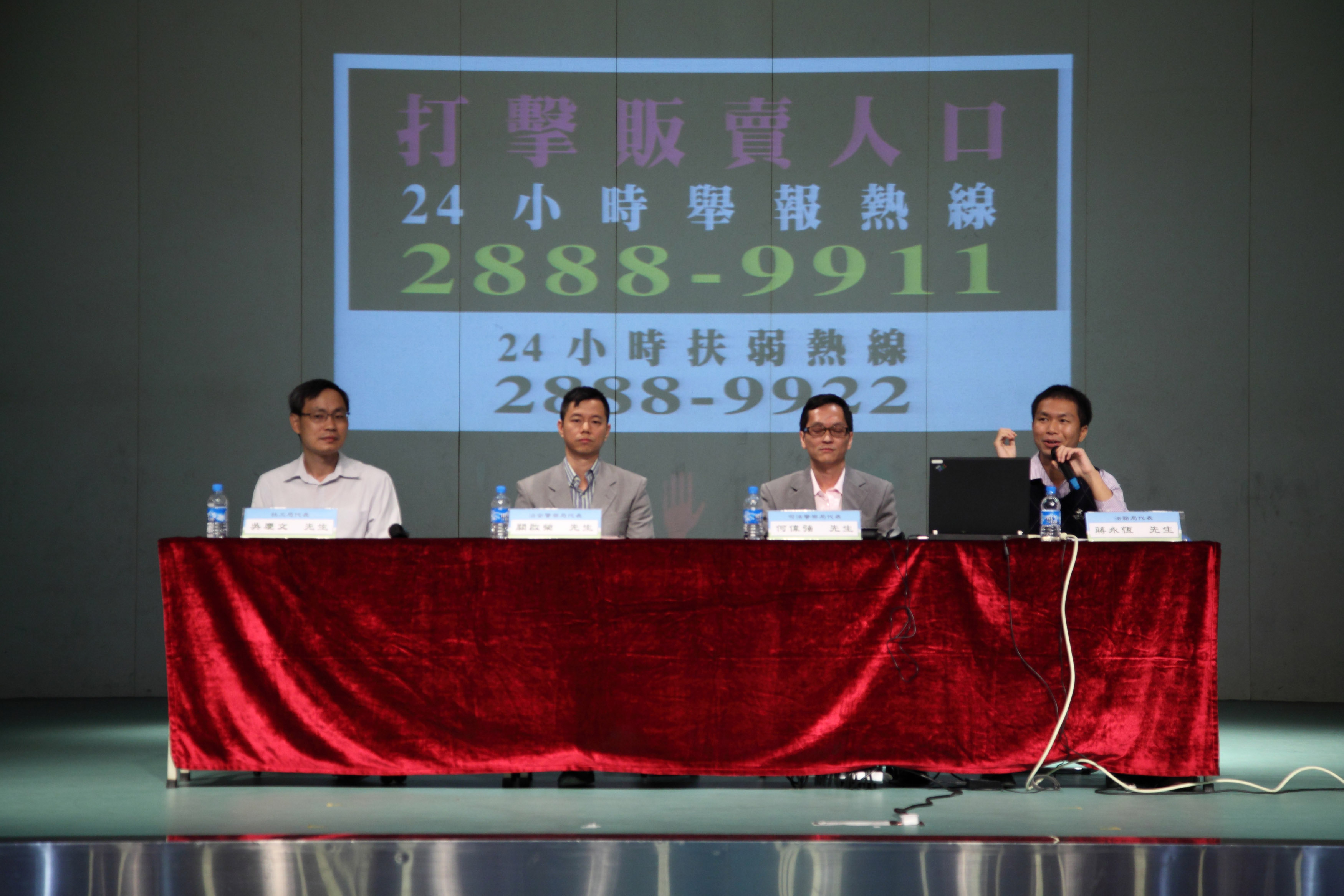 是次講座於十月八日上午假濠江中學舉行,邀請了阻嚇販賣人口措施關注委員會協調員黃傳發先生、保安司司長辦公室顧問何志遠先生及法務局法律推廣廳廳長羅靜萍小姐共同出席,並由治安警察局代表關啟榮先生、司法警察局代表何偉強先生、社會工作局代表吳慶文先生及法務局代表蔣永恆先生共同主講。