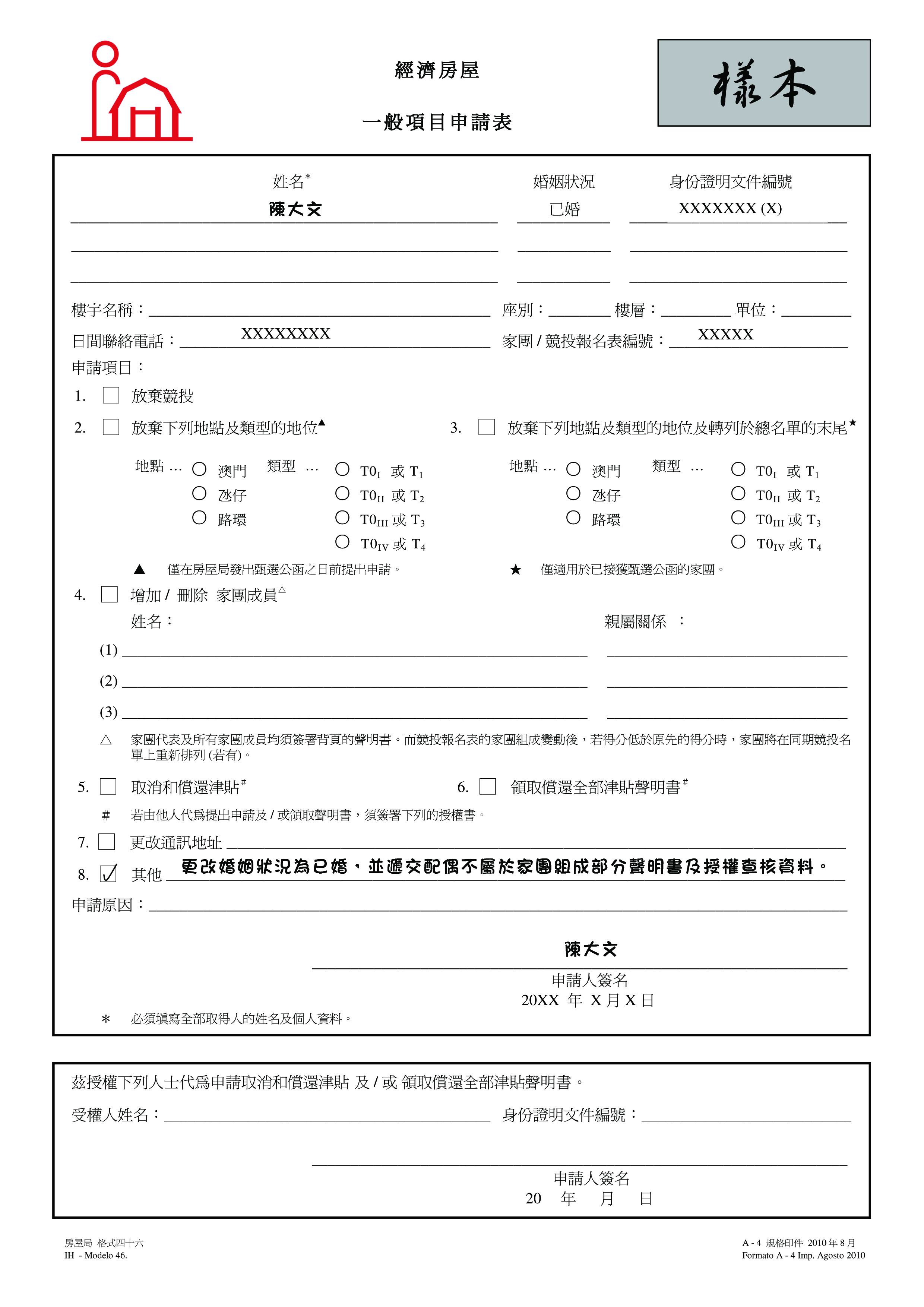 倘經濟房屋輪候家團代表或成員已婚,選擇不把配偶加入名單內,可填寫“經濟房屋一般項目申請表”,並於第8點“其他”之欄目內,指明“更改婚姻狀況為已婚,並遞交“配偶不屬於家團的組成部分聲明書”。聲明書由該名配偶填寫及簽署後,聯同已填妥之一般項目申請表及授權查核資料之聲明書,及該名配偶之身份證副本交回房屋局便可。上述申請表及聲明書均可在房屋局網站(www.ihm.gov.mo)下載區之“常用表格”下載,亦可親臨房屋局索取。