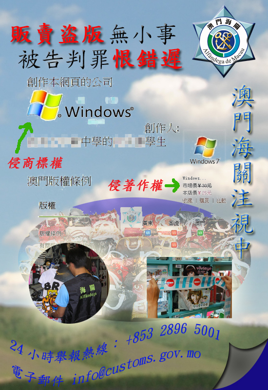 澳門海關接獲市民舉報,指在網上發現有人公開銷售懷疑侵權電腦軟件,並從事向顧客提供安裝電腦軟件服務,收費由澳門幣二十五元至八十元不等,海關接收舉報資料後,立即展開調查和取證,結果除發現嫌疑人在網上公開銷售電腦軟件外,更利用微軟 “Microsoft”集團跨國電腦公司已註冊登記之商標圖案和視窗 “Windows”文字圖案,在包括外地數個網站內架設網頁和設立自稱“Windows XXX有限公司”標語,以圖加強獲得消費者之信任。