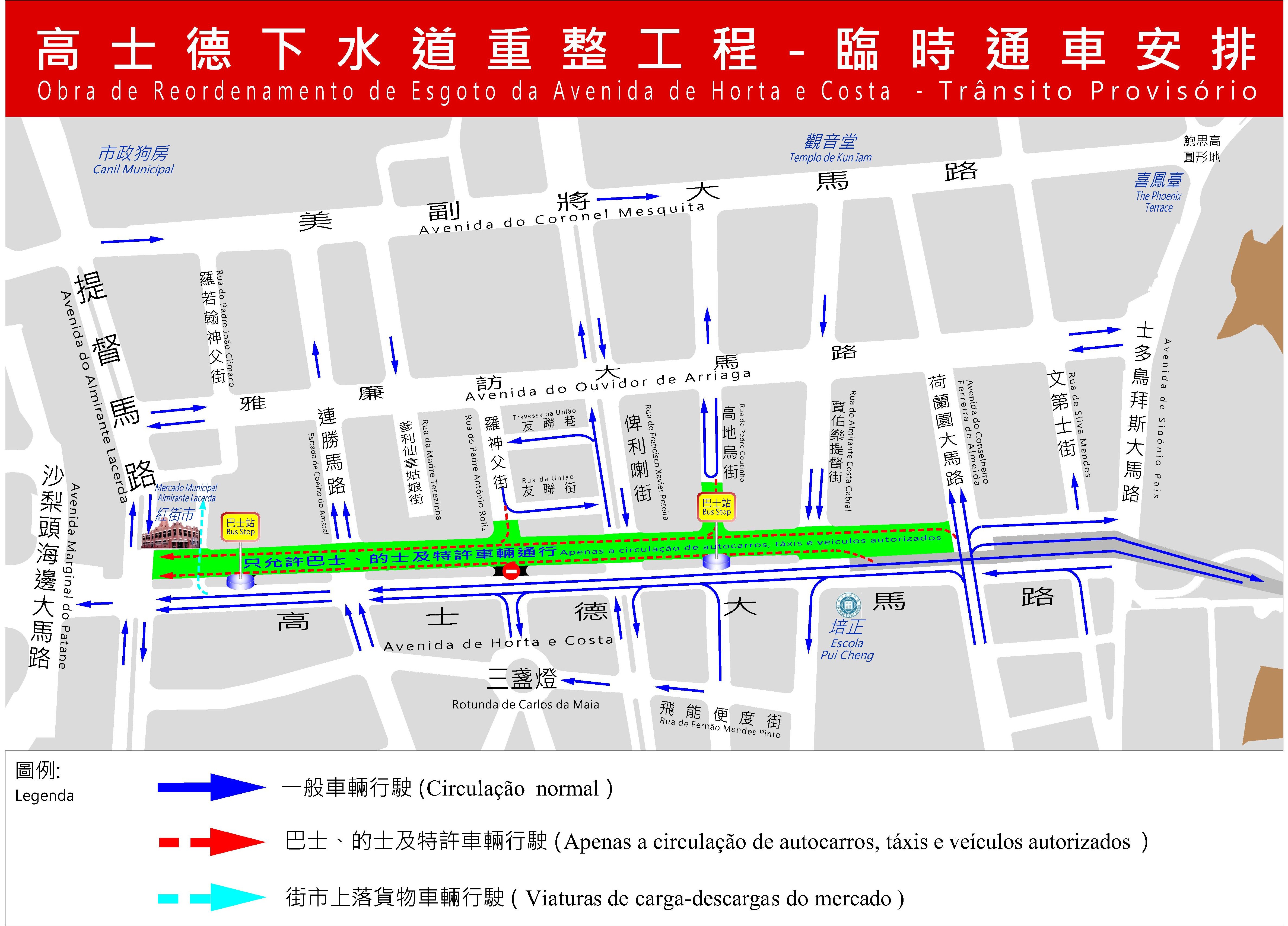 另一方面,為進一步疏導交通及配合交通管理需要,臨時通車期間,將對私人車輛及公交車輛作出分流安排,行車方向左側(即靠培正中學一側)的行車道將供一般車輛通行;至於公共巴士及的士則行駛右側車道(即靠紅街市一側)。現時高士德大馬路使用中的兩個臨時巴士站將繼續使用。