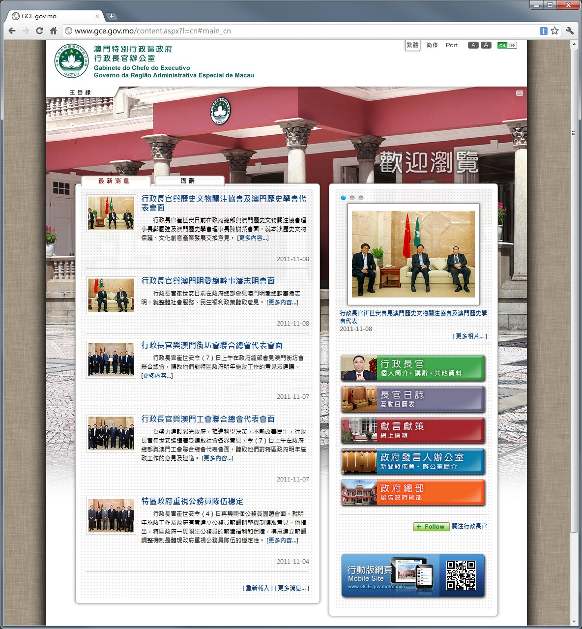行政長官辦公室網站同時設置了“行動版”(www.gce.gov.mo/mobile),可供智能手機、平板電腦等移動設備使用。