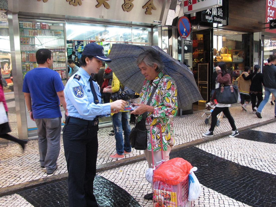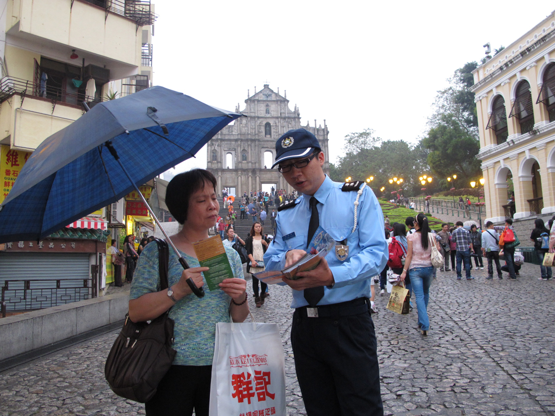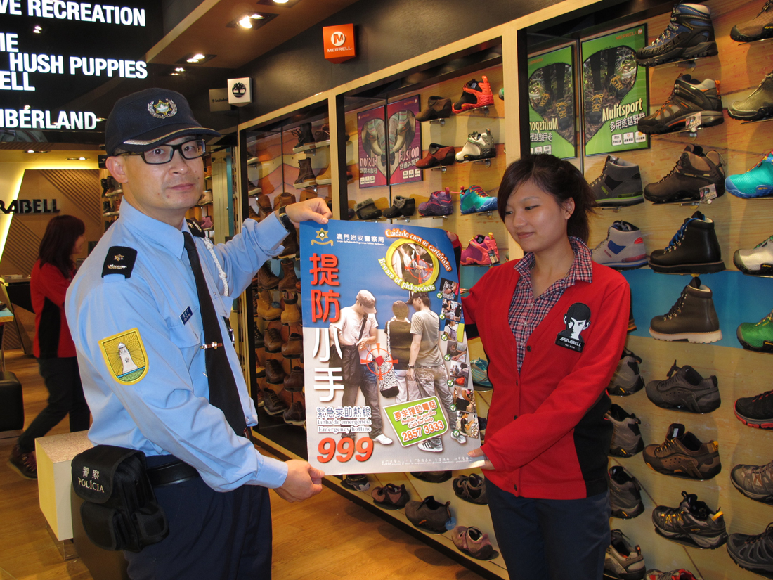 今天下午三時三十分,本局公共關係處源劍鋒副警司及鍾倩怡副警司、連同第一警務警司處陳德平警長等人,到議事亭前地、板樟堂及大三巴牌坊一帶進行防扒及防店鋪盜竊宣傳活動。期間,宣傳隊向居民及遊客派發“提防小手”小冊子,講解常見的犯罪手法,並即場對財物外露的人士作出溫馨提示,讓其了解正確保管財物的方法;亦向周邊的商鋪進行防店鋪盜竊宣傳,講解店鋪防盜的注意事項,並向店員派發防罪海報,提醒店員關於賊人的作案手法,特別在人多擠迫的時候提高警覺,以及適時提醒顧客注意個人財物安全,在有需要時應報警求助。