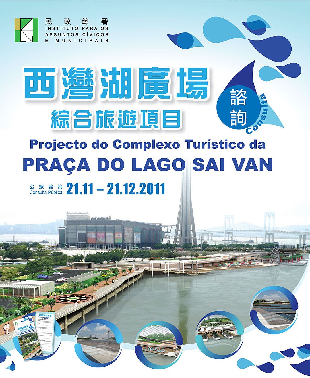 為完善“西灣湖廣場綜合旅遊項目”,民署將就有關項目作公開諮詢,諮詢期由本年十一月廿一日至十二月廿一日,誠邀社會大眾就此諮詢內容踴躍發表意見。市民可透過電話:2833 7676、傳真:2871 1203、電郵:gc@iacm.gov.mo或郵寄至民署大樓、各市民服務中心及服務站(地址如下)等方式把意見送交民政總署。