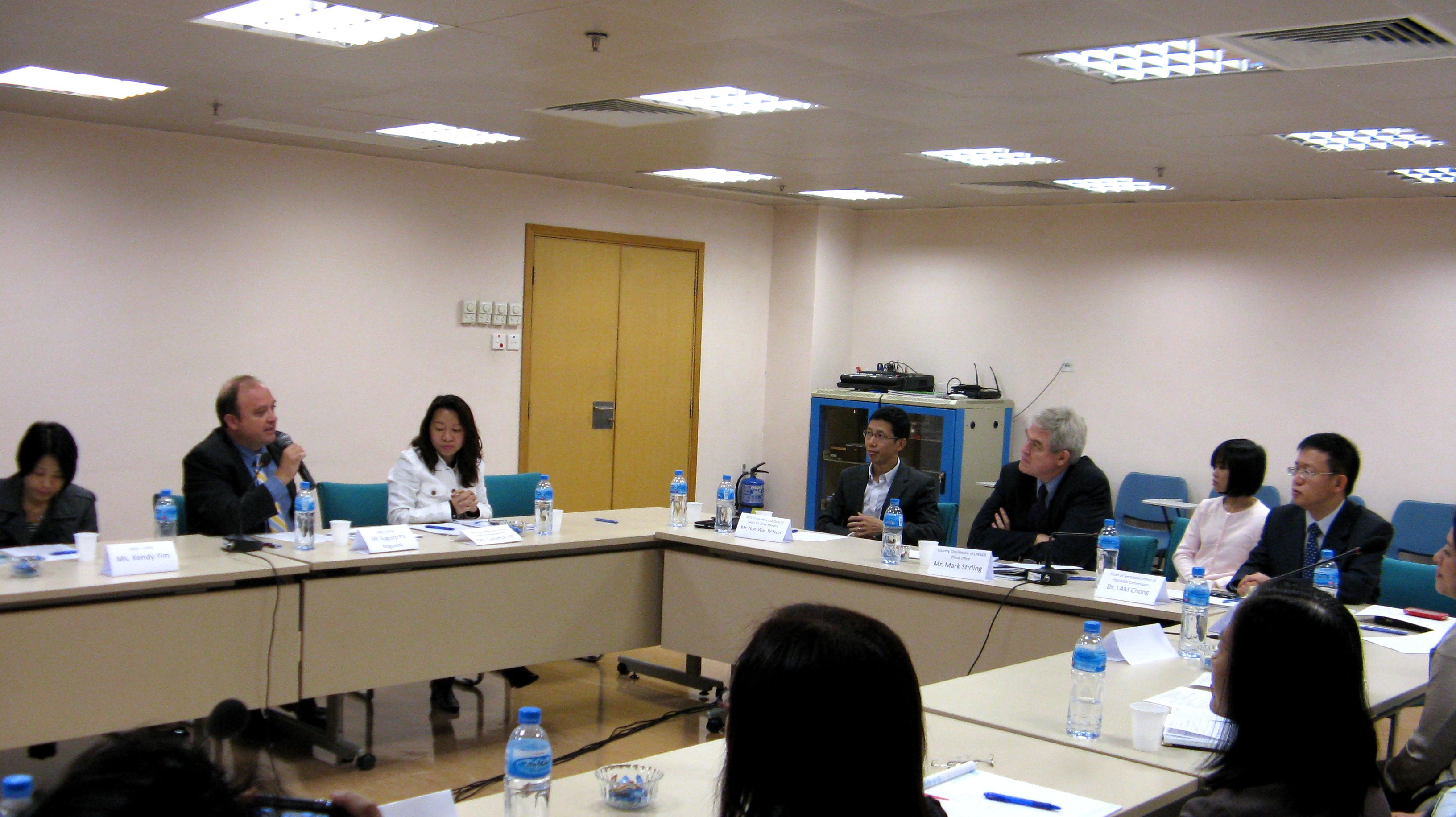 防治愛滋病委員會秘書長林松、社工局韓衛廳長、衛生局捐血中心許萍主任、教育暨青年局德育中心黃艷蘭主任、澳門關懷愛滋病協會謝燕儀理事長、澳門戒毒復康協會Augusto P.V. Nogueira先生、澳門外展協會的負責人,仁伯爵綜合醫院感染科范蘊明醫生等分別先後向馬克先生介紹了防治愛滋病委員會成立以來澳門所開展的各項愛滋病防治活動和取得的成效,以及面臨的挑戰。