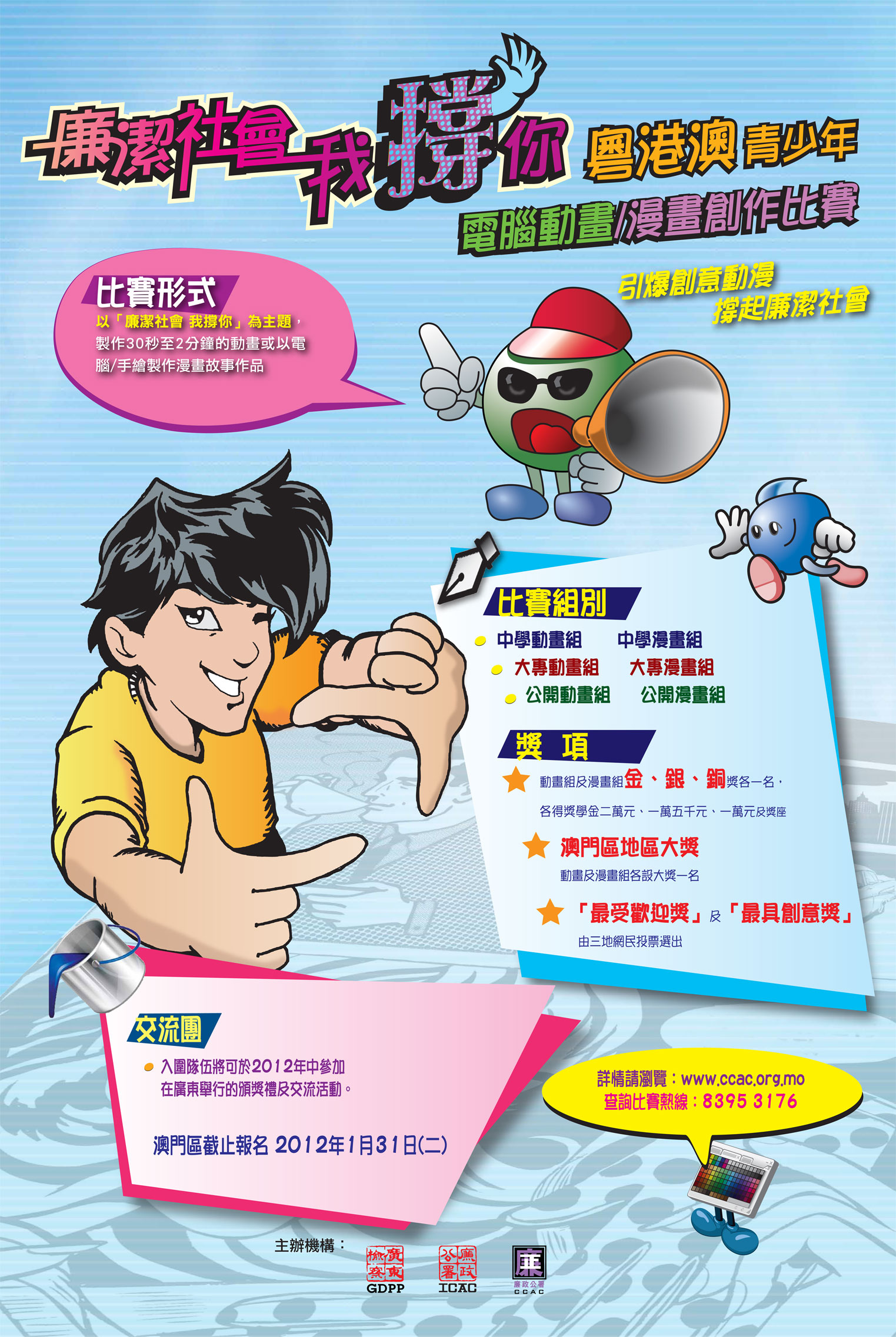 澳門廉政公署、香港廉政公署及廣東省人民檢察院將聯合主辦「粵港澳青少年電腦動畫及漫畫創作比賽」,年齡在30歲或以下的粵、港、澳青少年,均可按不同組別參加比賽,用創意宣揚反腐倡廉訊息。