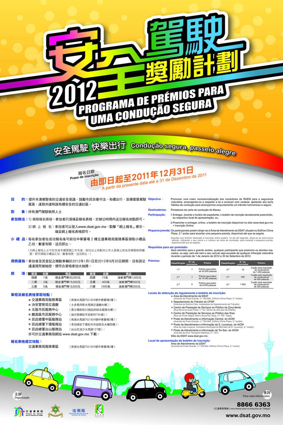 「安全駕駛獎勵計劃2012」將於本月底截止報名,有興趣參加的人士可於月底前前往指定地點索取章程及報名表格,填妥後交回中華廣場二樓交通事務局服務專區,又或是登入交通事務局網頁www.dsat.gov.mo直接報名。
