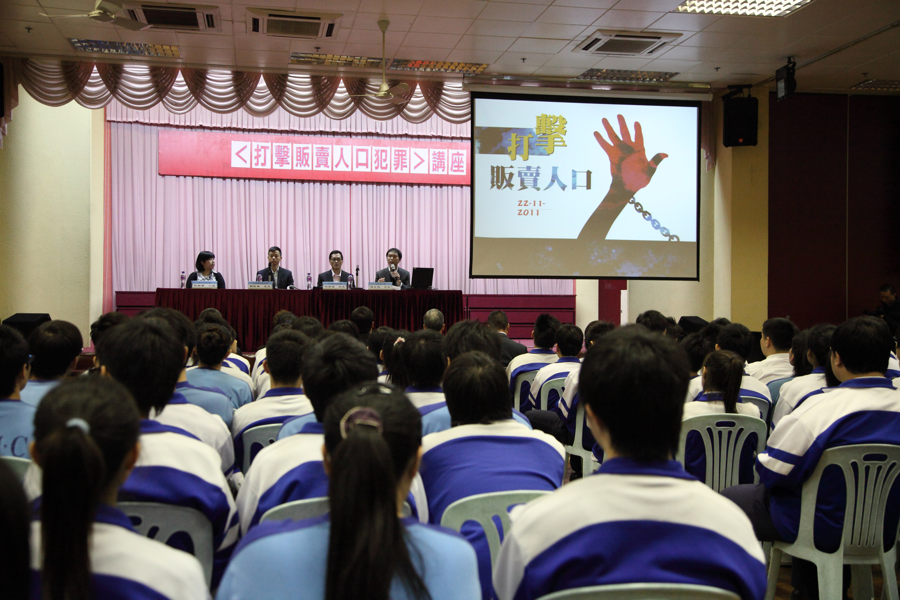在販賣人口案件中的受害人往往因為對犯罪集團的犯罪手法認識不足,而無知受騙,故講座特別為即將畢業的莘莘學子們,介紹有關“打擊販賣人口犯罪”的法律訊息、個案分析、求助方法以及受害人的保護措施等,幫助學生們瞭解更多有關販賣人口組織慣用的犯罪手法及相關法律知識。此外,在講座中亦播放與打擊販賣人口有關的宣傳影片,提醒學生們在市面上經常會出現各種免費海外留學和高薪海外工作的廣告,而當中可能有些是販賣人口組織的陷阱,故在尋找海外升學和工作時,應要多加注意,小心誤墮陷阱。