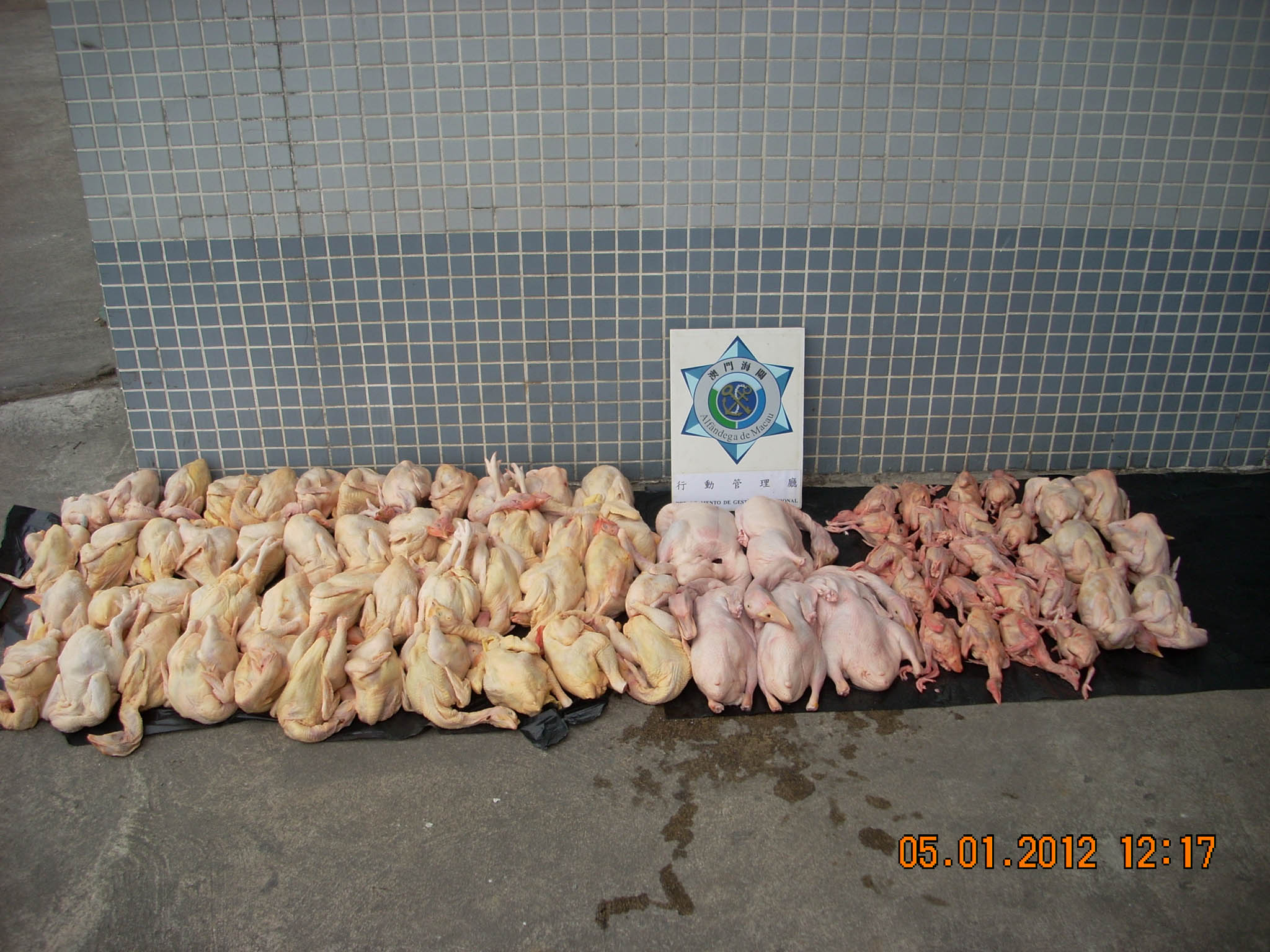 於今天早上約10時30分,關員在關閘馬路如意閣大廈商場內進行監視,發現部份回澳水客將膠袋包裹之物品放在上址商場內的男厠後便離開。其後,有一名林姓男子,年約53歲的澳門居民,在上述地點運走該批物品時﹐海關人員立即採取行動,檢獲一些未經檢疫的家禽。調查期間,該名男子聲稱這批未經檢疫的家禽是其致電內地一雞販購買的,並於今日早上安排水客以螞蟻搬家的形式帶回本澳。而其利用該厠所進行收集及稍作清洗家禽後,準備供應澳門市內的食肆作為食材。經點算後,海關檢獲未經檢疫之家禽有﹕己宰鮮雞53隻,重67公斤、己宰鴨5隻、重15公斤及己宰乳鴿20隻,共91斤。