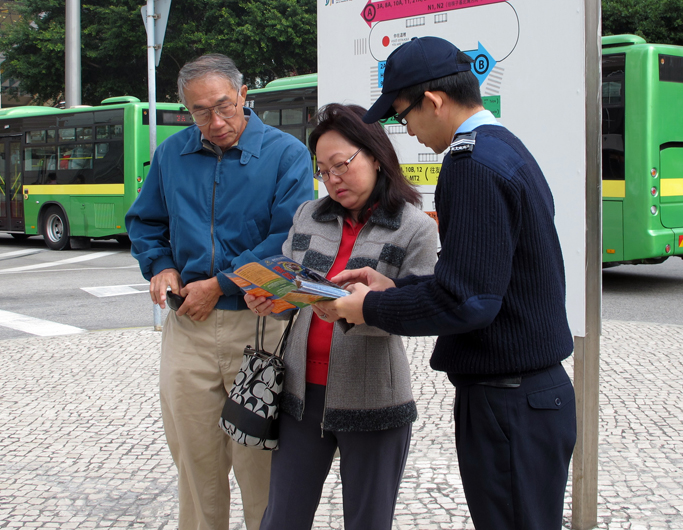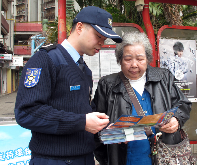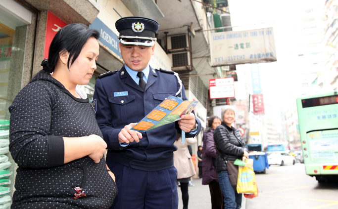 今天上午,本局行動廳副警司黃超文、劉國熙,以及宣傳人員一行8人,分成兩小隊在澳門及離島共八個主要巴士站點進行防扒宣傳,包括關閘巴士總站、十六浦、亞馬喇迴旋處、氹仔新世紀迴旋處、馬會前地、提督馬路、筷子基、高士德馬路等地點巴士站及鄰近範圍。是次宣傳活動是配合近日冬防行動而進行,同時考慮到去年街道及巴士扒竊情況,本局錄得2011年的巴士盜竊個案比對前一年由98宗上升至210宗,故此持別在歲晚加強宣傳。