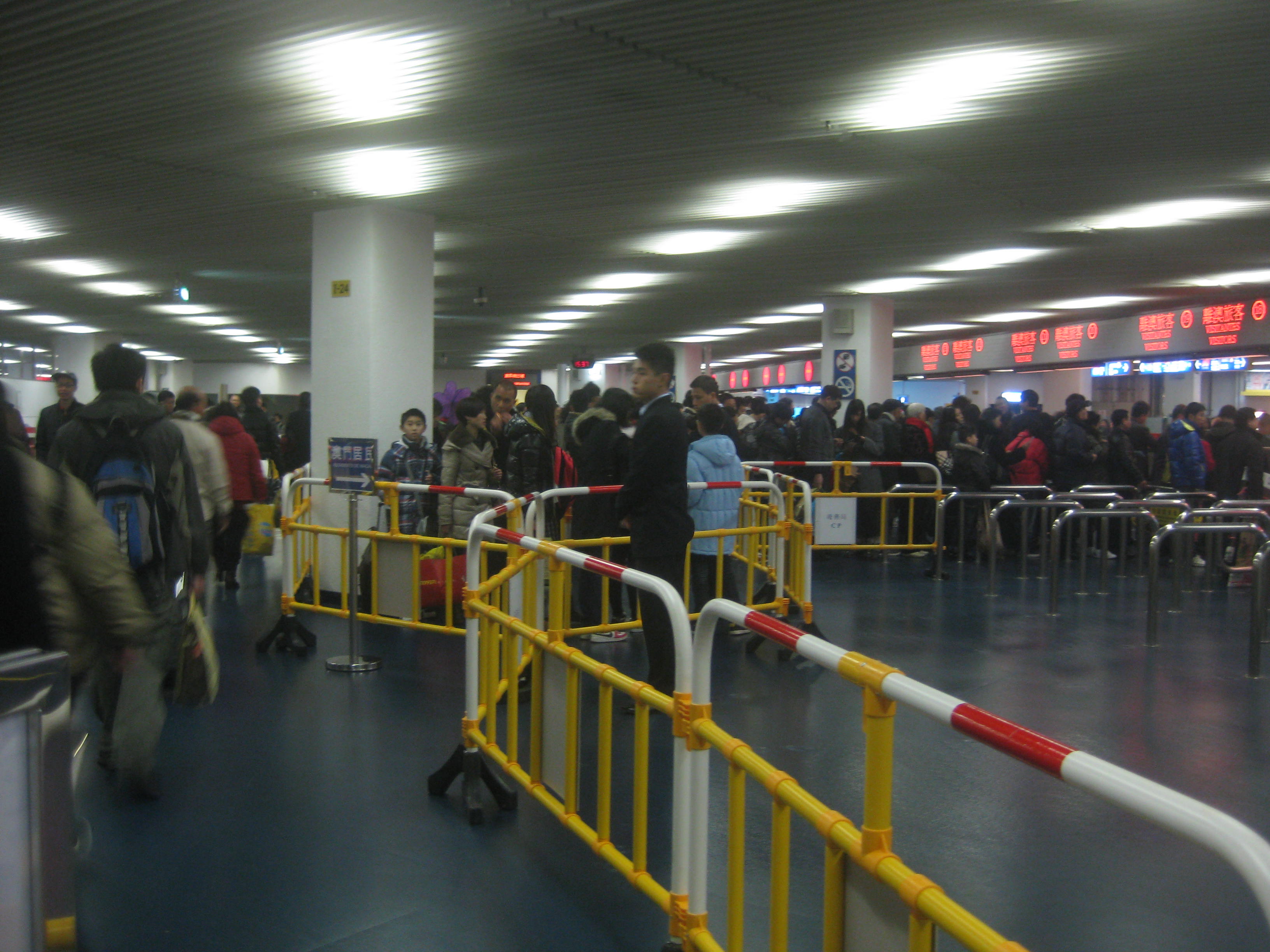 為應對旅客出境高峰潮,港務局已提早於1月19日將有助維持秩序的入境人流管理措施擴展至離境候檢區域,於該區域設置以膠馬組成圍欄來控制離境人流,同時設置指示牌及訊息廣播,分流澳門居民及已登記自助過關人士到自助過關系統區域,將大部分櫃台用作處理持其他旅遊證件人士,以縮短通關時間。此外,因應旅客人數的增加,治安警察局出入境事務廳亦儘量抽調人手增開驗證通道,及時疏導過關旅客。