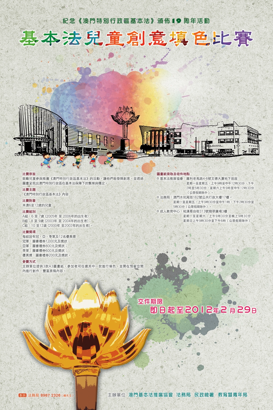 由澳門基本法推廣協會、法務局、民政總署及教育暨青年局共同舉辦的“基本法兒童創意填色比賽”將於二月二十九日截止報名。主辦單位希望藉由是次比賽鼓勵兒童積極參與推廣《澳門特別行政區基本法》的活動,讓他們能發揮創意,並透過圖畫呈現澳門特別行政區在基本法保障下的繁榮與穩定。
