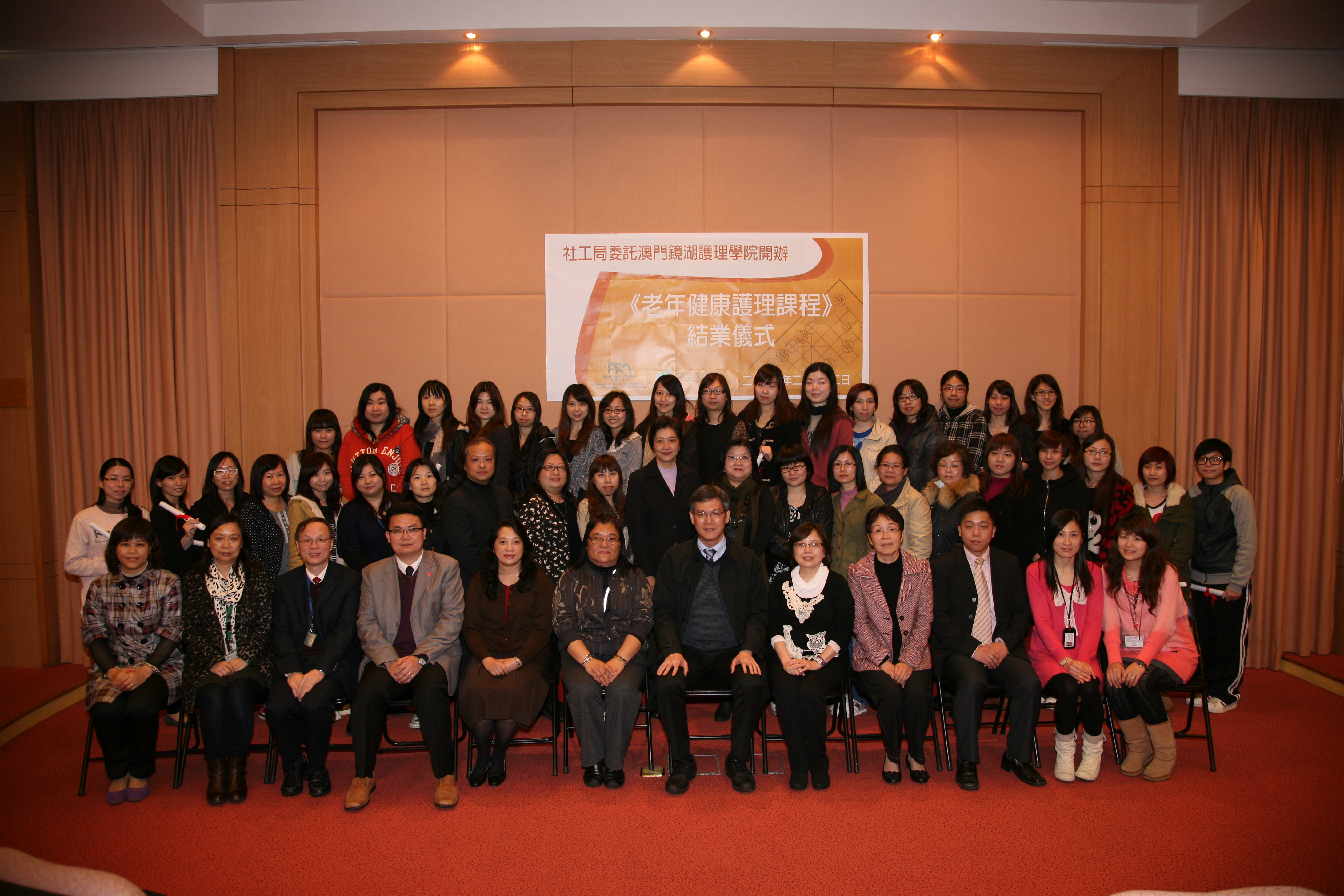 社會工作局委託澳門鏡湖護理學院開辦的老年健康護理培訓課程,是一項為期三個月的在職進修培訓課程,目的藉以提升社區護士於老年護理方面的專業知識及技巧,期望學員在完成學習後,能運用所學的知識技能,配合醫療護理的發展需要,更好地照顧每一位服務對象。課程內容包括現今對老年人的健康需求、心理健康及人際互動、用藥及應急知識、倫理及社會問題,與及澳門的長照服務、院舍感染控制等等。該課程自去年10月開課,並在本年2月22日假澳門鏡湖護理學院舉行了結業典禮,當日社會工作局社會互助廳蔡兆源廳長、長者服務處林佩嫦處長、澳門鏡湖護理學院尹一橋院長、校外進修部劉嘉寶副主任、受訓的學員及安老服務機構的負責人出席。蔡兆源廳長在致辭中表示,現時本澳已進入老齡化的社會,安老服務機構的護理人員須針對老人的身、心、社、靈的需要,提供更好的服務。未來社會工作局將進一步開展老年護理的在職培訓及持續進修課程。劉嘉寶副主任感謝社會工作局大力支持籌辦是次的培訓課程,並對導師和學生所付出的努力和取得的成績,給予高度的評價及讚賞。