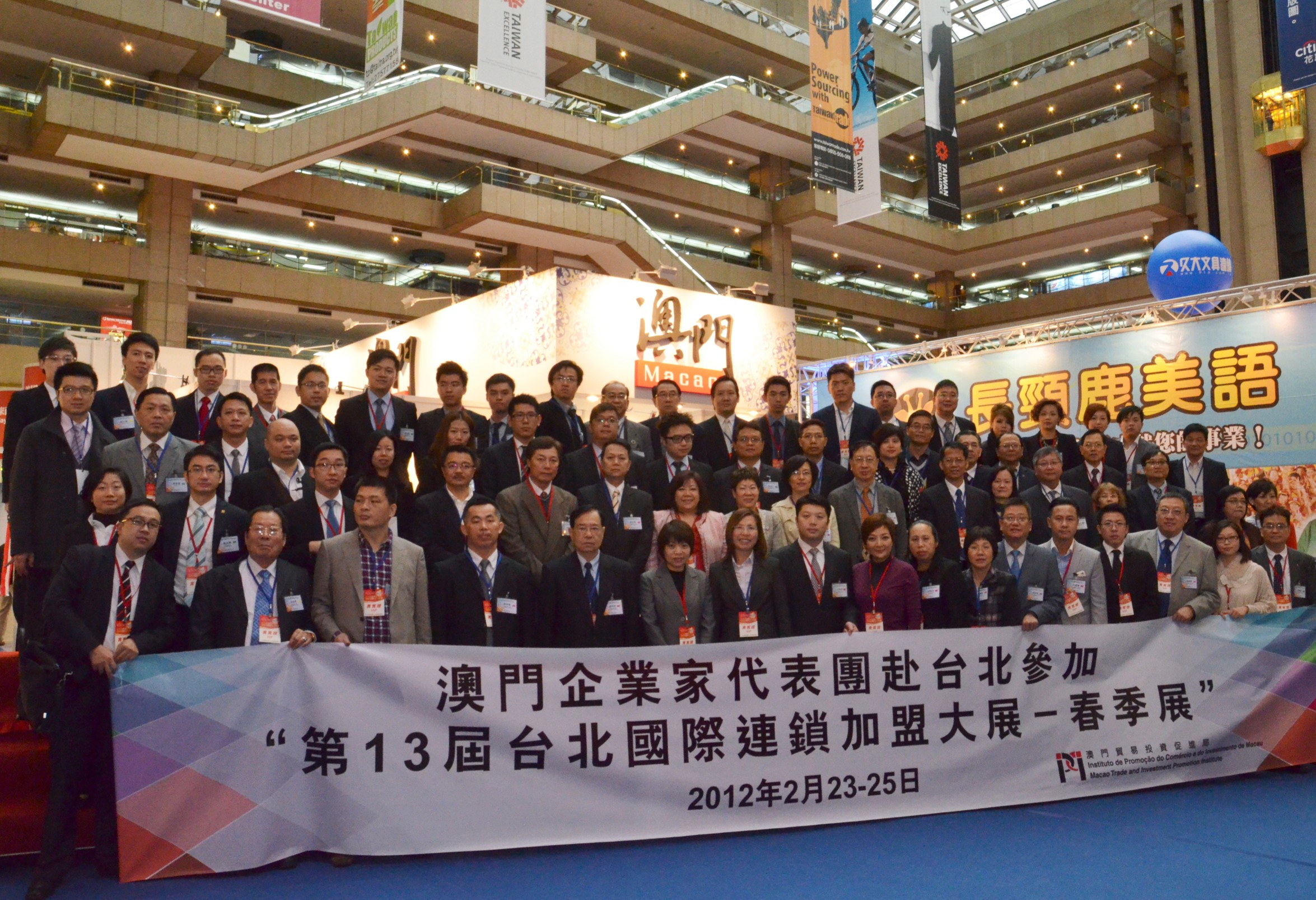 由澳門貿易投資促進局組織一行79人的澳門企業家代表團於2012年2月23至25日赴台北參加「第13屆台北國際連鎖加盟大展-春季展」(簡稱“TICFE2012”)。該局更藉此契機於2月21至25日開辦名為「連鎖加盟建品牌‧創事業 - 連鎖加盟總部訓練班」,參會代表期間亦參訪了多個台灣知名連鎖品牌企業。貿促局指,為鼓勵澳門企業以連鎖加盟方式拓展品牌事業,該局自去年2月曾組織代表團往台北參觀「12屆台北國際連鎖加盟大展-春季展」(簡稱“TICFE2011”),並於12月首次舉辦 「連鎖加盟建品牌‧創事業課程 - 台灣考察團」,反應良好。是次考察為進一步讓本澳企業透過訓練課程及參觀展覽活動了解台灣之加盟行業,從而為建立澳門品牌連鎖事業打下基礎。