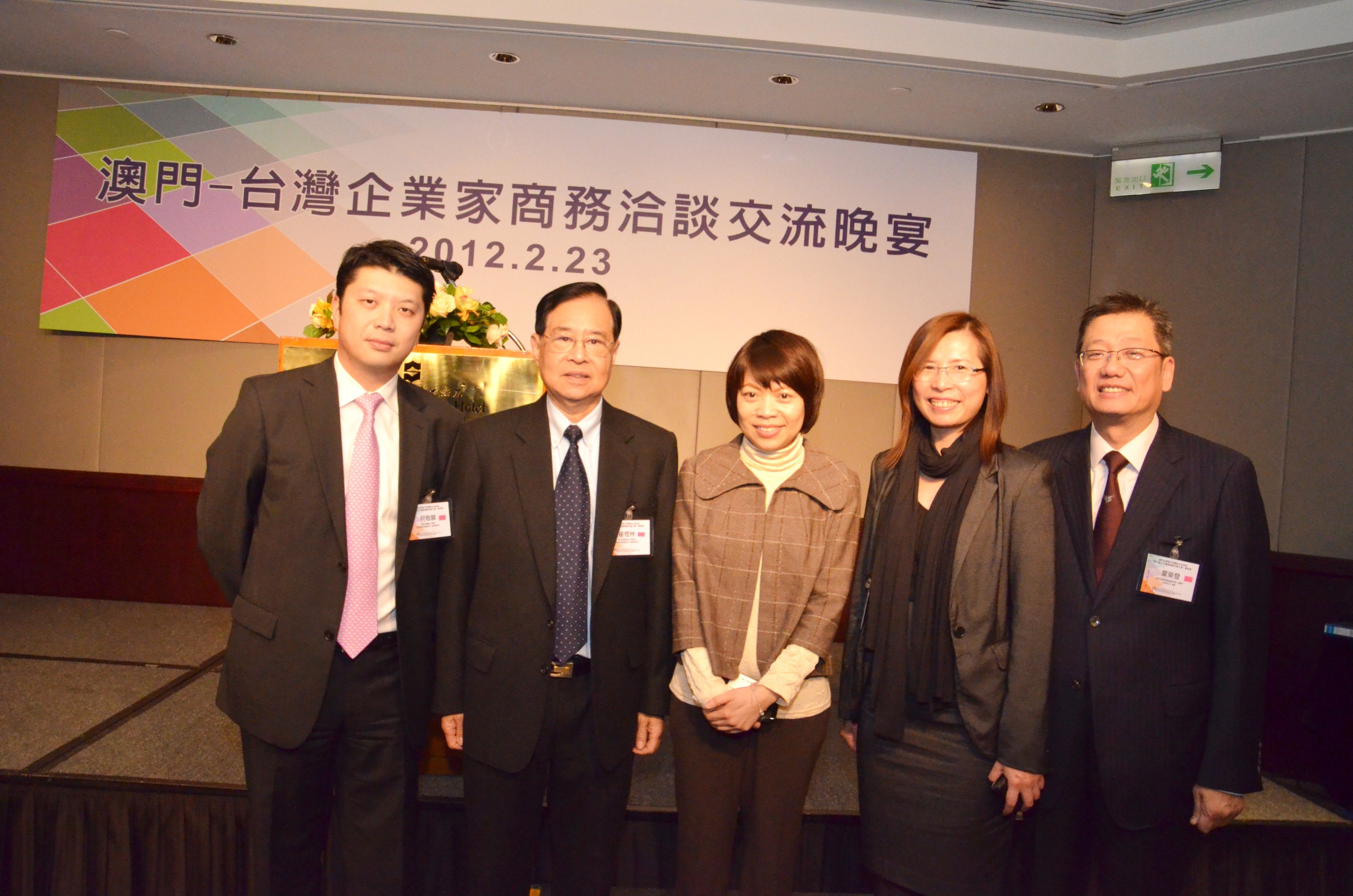 2月23日更與台灣對外貿易發展協會(TAITRA)共同舉辦了「澳門-台灣企業家商務洽談交流晚宴」,邀請多個台灣具品牌魅力之企業代表與代表團成員交流,共商合作契機。貿促局陳敬紅執行委員於晚宴期間致辭,並向現場約130名與會者介紹澳門投資環境及推介一年一度的國際品牌合作盛事 - 2012MFE。台灣對外貿易發展協會市場研究處吳立民處長向代表團致以最熱切的歡迎,該處林淑惠研究員亦向與會嘉賓介紹了台灣最新經貿情況。約50名連鎖行業機構及台灣品牌企業代表出席了晚宴,包括青創總會陳世銘總會長、香港專利授權及特許經營協會李偉生會長、社團法人台灣連鎖加盟促進協會傅信欽副理事長、經濟部中小企業處創業育成組林士良組長、巨星造船股份有限公司陶君亮董事長、1111人力銀行王孝慈副董事長兼集團總經理、白甘蔗養生涮涮屋孔相涼董事長等。
