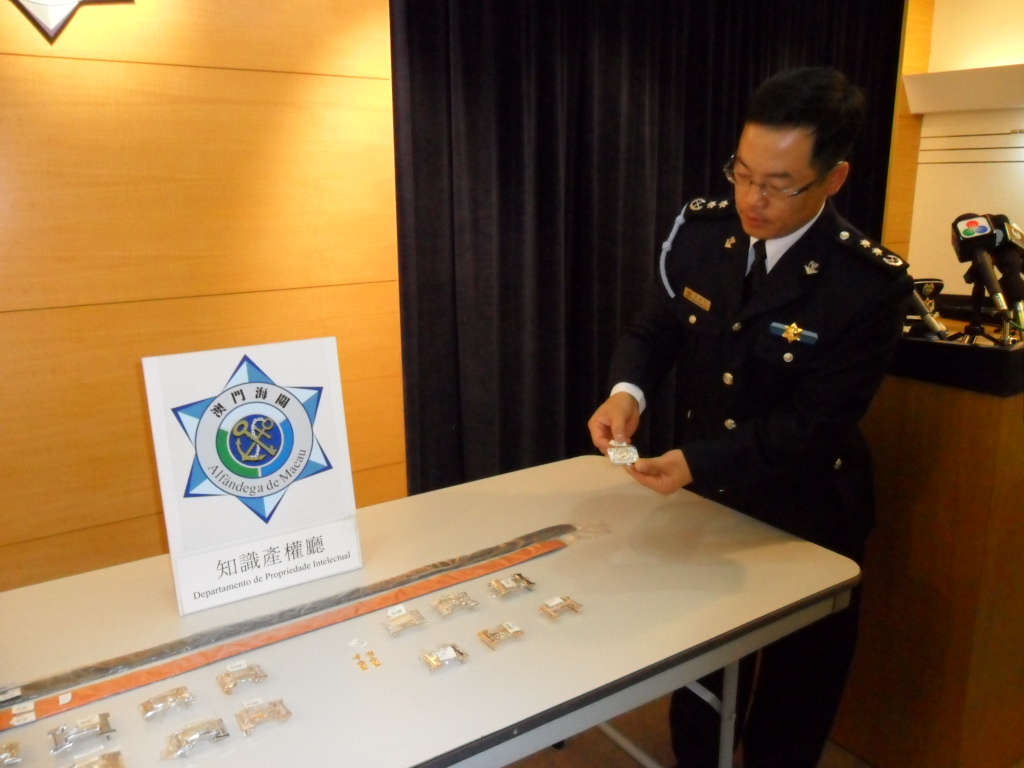澳門海關接獲電子郵件舉報,指位於澳門中區某兩間珠寶鐘錶店,出售侵犯商標知識產權之鑽石皮帶扣,海關收到舉報資料後,立即展開調查,核實有關商標已在澳門特區政府經濟局註冊登記。該兩間珠寶鐘錶店同時經營典當生意,店舖為相連並可以互通,由一名姓譚之男嫌犯所開設。經查核資料,該名譚姓嫌犯已有前科,曾於二零零六年售賣同類貨品被檢控。有關貨品售賣對象以該區數個大型娛樂場的賭客和外地遊客為主。