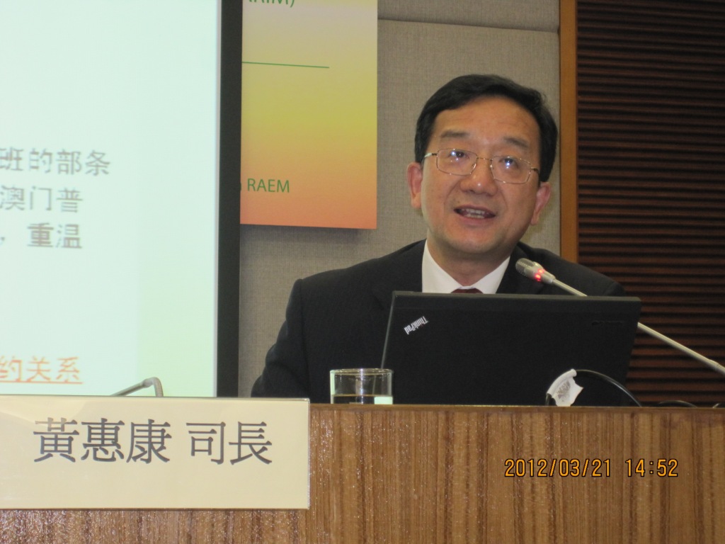 由外交部、澳門特區行政法務司主辦,外交部條約法律司、澳門特區法律及司法培訓中心合作執行舉辦的第二期“中國外交發展的熱點問題”專題講座,由今天(21日)起至23日,每天下午二時三十分至五時三十分假公務人員培訓中心演講廳舉行,邀請了外交部條約法律司黃惠康司長、馬新民參贊及吳海文處長主講,講述及分析當前國家在外交發展方面的熱點問題。