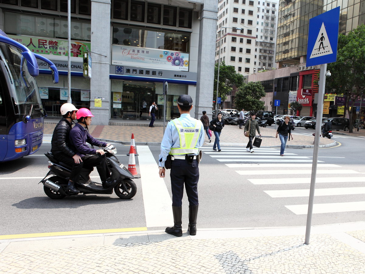 今天上午,本局交通廳警司張映順、副警司容仕培及張建欣一行12人,在澳門宋玉生廣場及建興龍廣場一帶,針對斑馬線不讓先採取檢控行動。是次行動是配合交通安全推廣活動而進行。本局考慮到去年在人行橫道發生涉及行人及車輛的交通事故有所上升,由2010年的276宗增至2011年的323宗,故加強檢控,提升守法意識。
