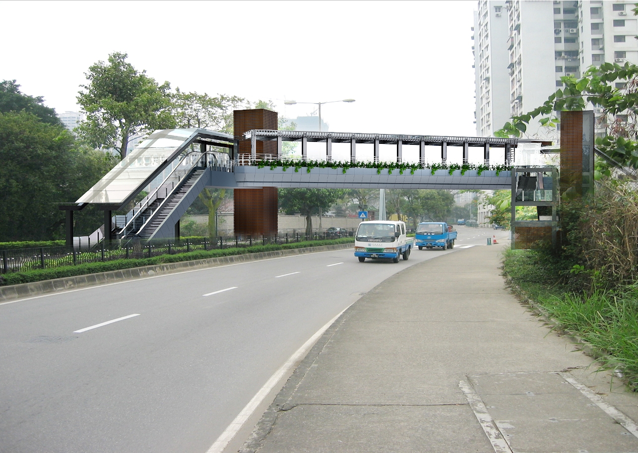 橫跨氹仔高勵雅馬路的行人天橋橋面全長24.8米、淨寬3米,採用玻璃連廊有上蓋式設計,橋面兩旁設置玻璃圍欄,橋身兩旁及落腳點均設置花槽或花圃,起到綠化環境及加強安全感的作用。同時,設有樓梯、電動扶梯、升降機及導盲磚等無障礙設施,以構建無障礙步行系統,照顧有需要人士的出行需要。另外,馬路旁亦將增設金屬護欄,從而確保人車分隔。