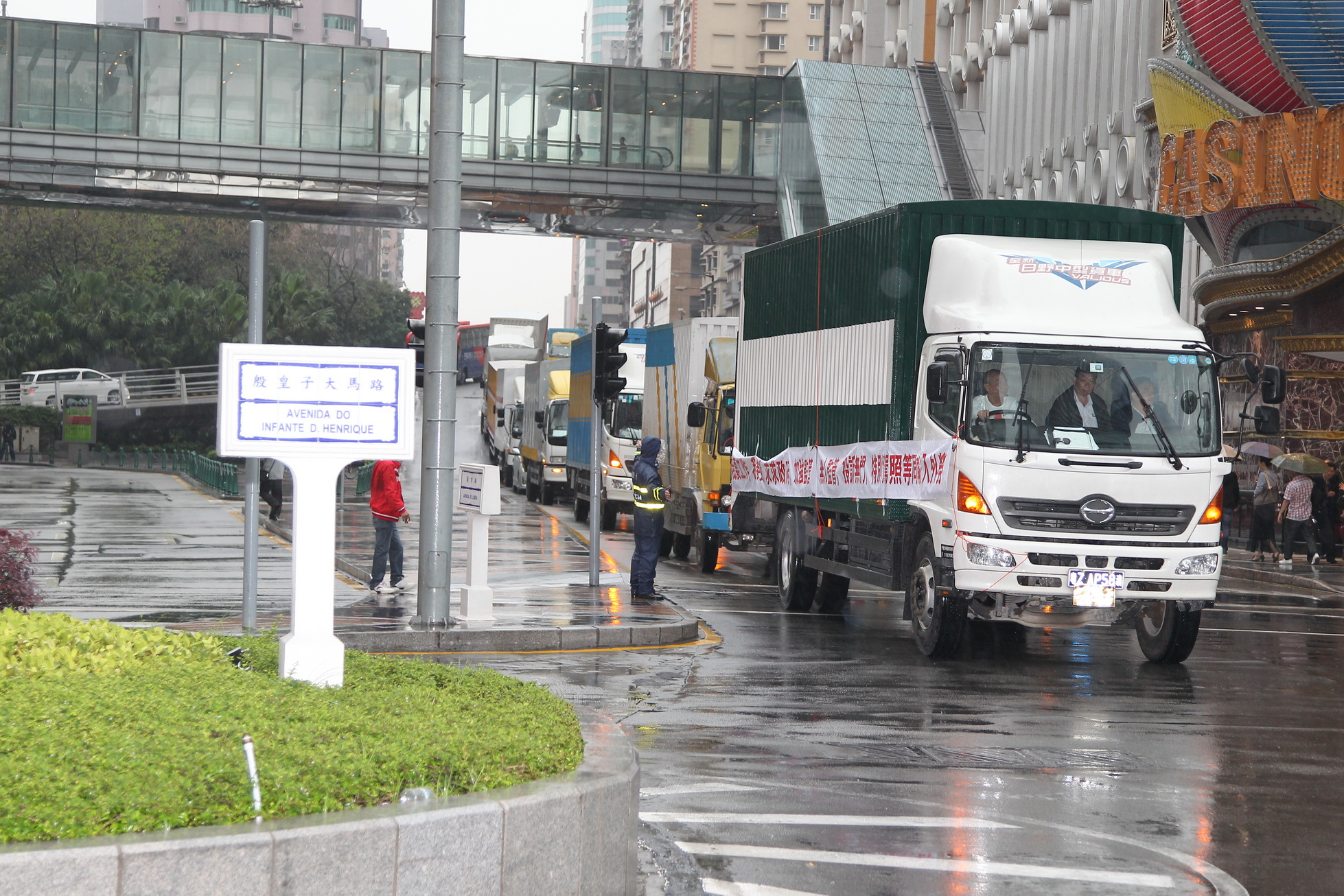 本年四月十六日上午八時許,澳門跨境汽車貨運從業員協會發起車輛罷駛行動,約80輛重型貨車等駛至路氹邊檢站集結,堵塞了邊檢站管制區門口5條出境車道中的4條,以及3條入境車道中的2條,嚴重阻礙交通。