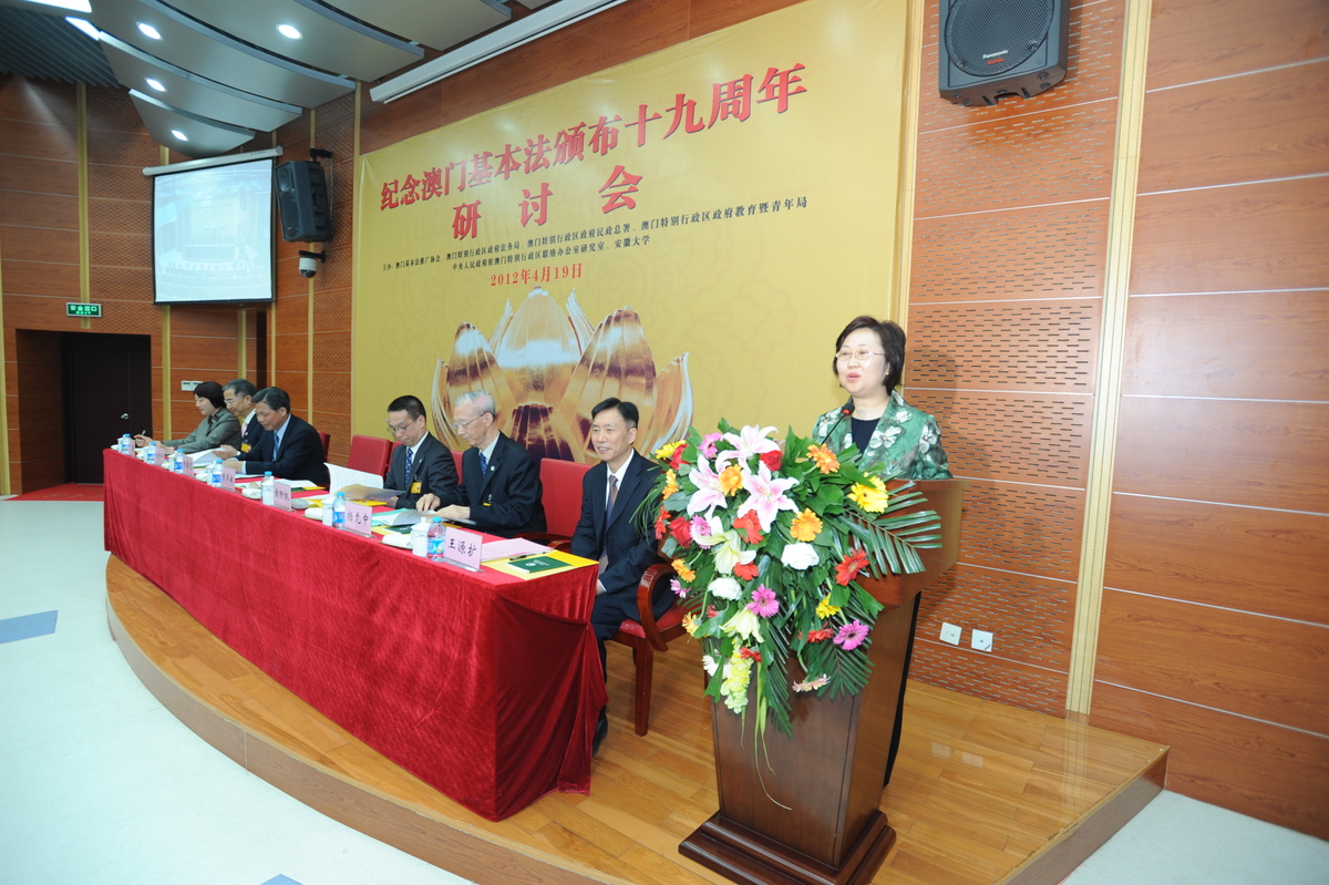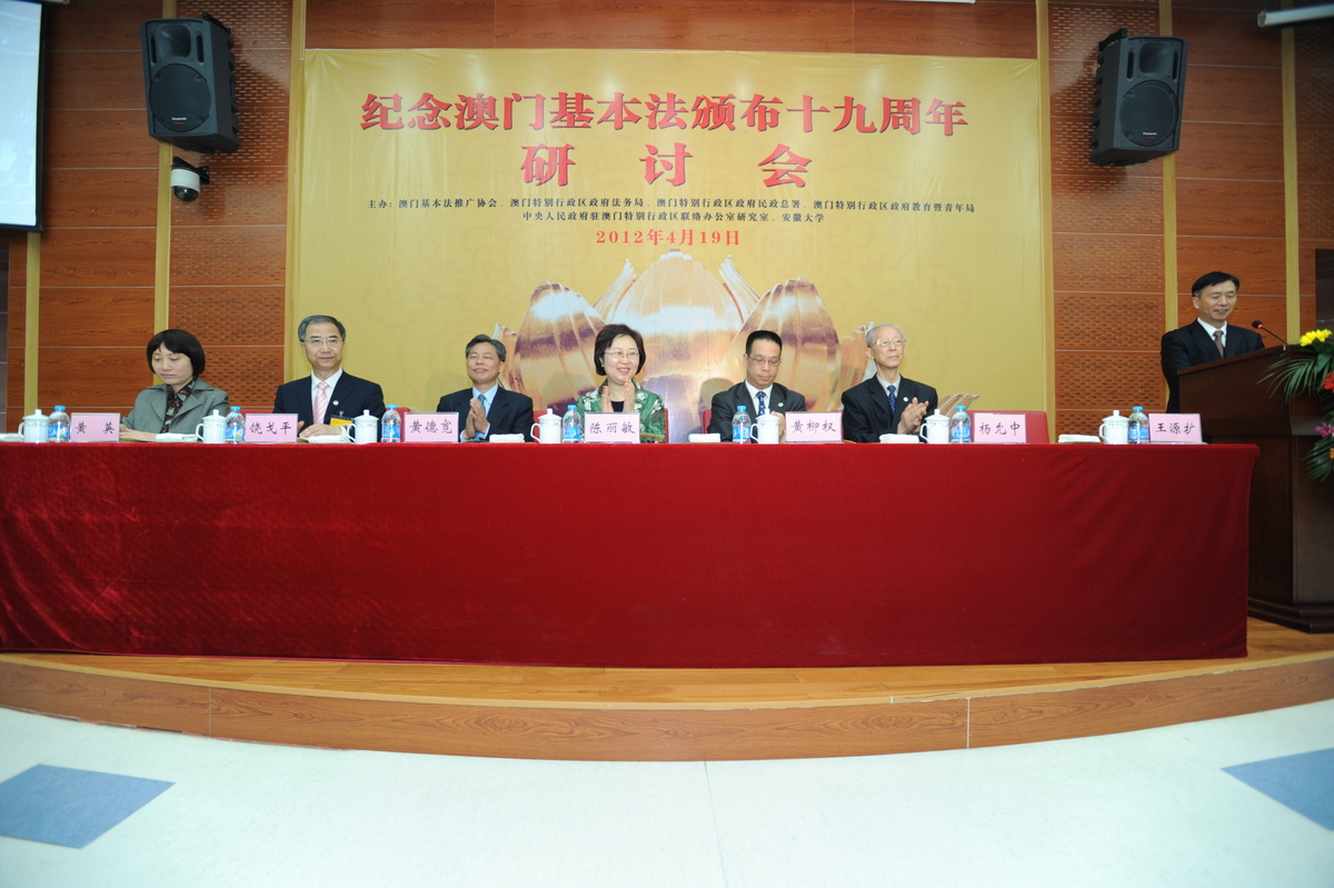 “紀念《澳門基本法》頒佈十九週年研討會”於4月19日在安徽大學舉行,澳門特別行政區行政法務司司長陳麗敏及安徽大學黨委書記黃德寬為研討會致詞。主講嘉賓有來自澳門、北京和安徽的專家學者,包括:國務院港澳辦法律司司長黃柳權、澳門基本法推廣協會副會長楊允中、北京大學法學院教授饒戈平、安徽大學法學院副教授李曉新。