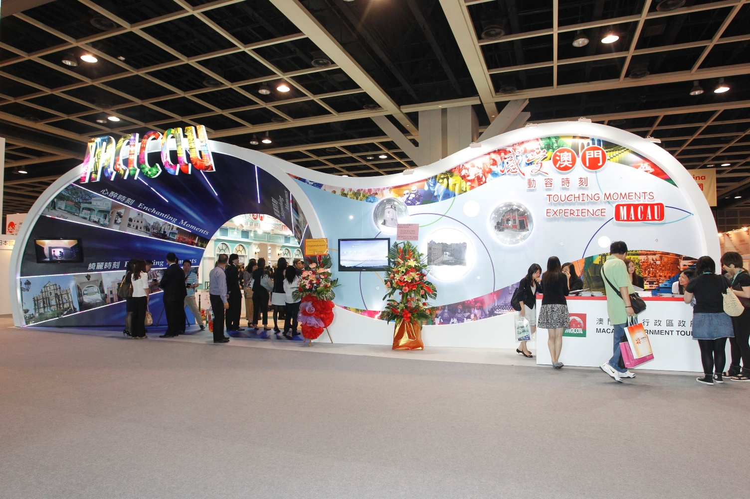 今年,旅遊局以「感受澳門 動容時刻」為宣傳主題,展位以葡式建築設計為主,突顯澳門四百多年的中西文化交融特點。展位入口的隧道把觀眾帶入澳門,讓大家感受當地「心醉」、「綺麗」、「驚喜」及「品味」的各個動容時刻。展場正中央展示了澳門的地標大三巴牌坊,襯托在圓形荷花池上,充滿濃厚的文化氣息。