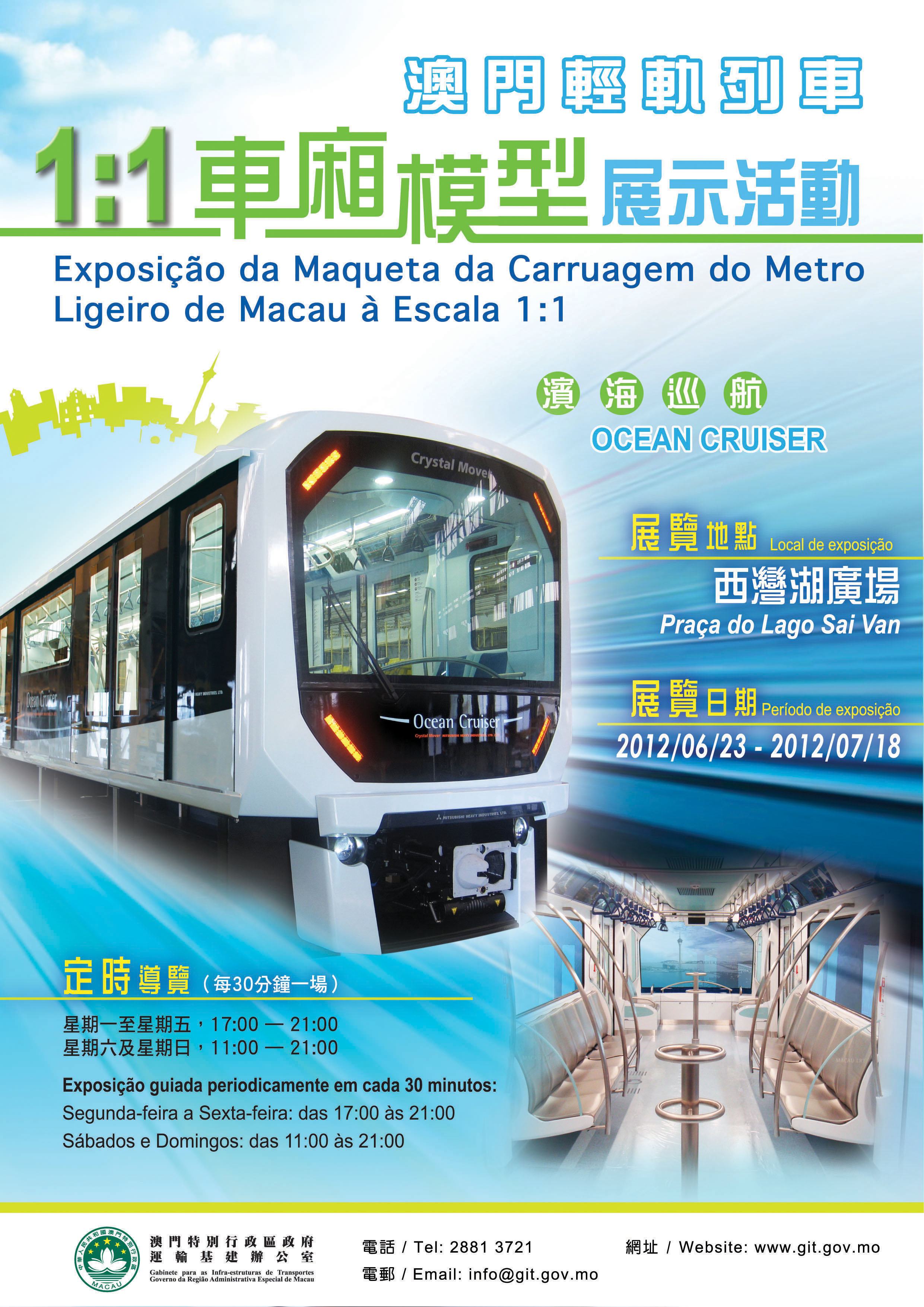 “澳門輕軌列車1:1車廂模型展示活動”由6月23日(周六)至7月18日舉行,活動期間並將安排定時導覽服務,為市民講解車廂的設計特點。定時導覽服務安排於周一至周五下午5時至晚上9時,以及周六、日早上11時至晚上9時,每30分鐘一場。展示活動同時亦為20人或以上的團體設立導覽預約服務,市民只需登入運建辦網站(www.git.gov.mo)下載預約表格填寫,即可簡便地安排觀賞時間並享有專門的導覽服務;凡參與展示活動的市民,均有機會獲得“澳門輕軌列車Q版水晶模型”壹份。