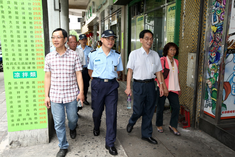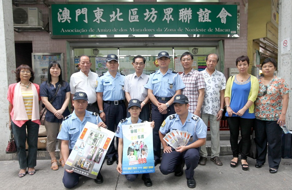 六月二十日上午,治安警察局與街總大廈管理資源中心,聯同東北坊會聯合進行社區巡察活動,治安警察局行動廳副警司黃超文、澳門警務廳警長劉永昌等一行十多人,首先前往東北區坊眾互助會與業主會代表及街坊會面,聽取關於區內治安秩序的意見和建議。大廈管理資源中心主任陳溥森、副主任李惠萍、街總副監事長林文彬、秘書歐銀煥、東北坊會副理事長周福源及業主會代表出席了活動。