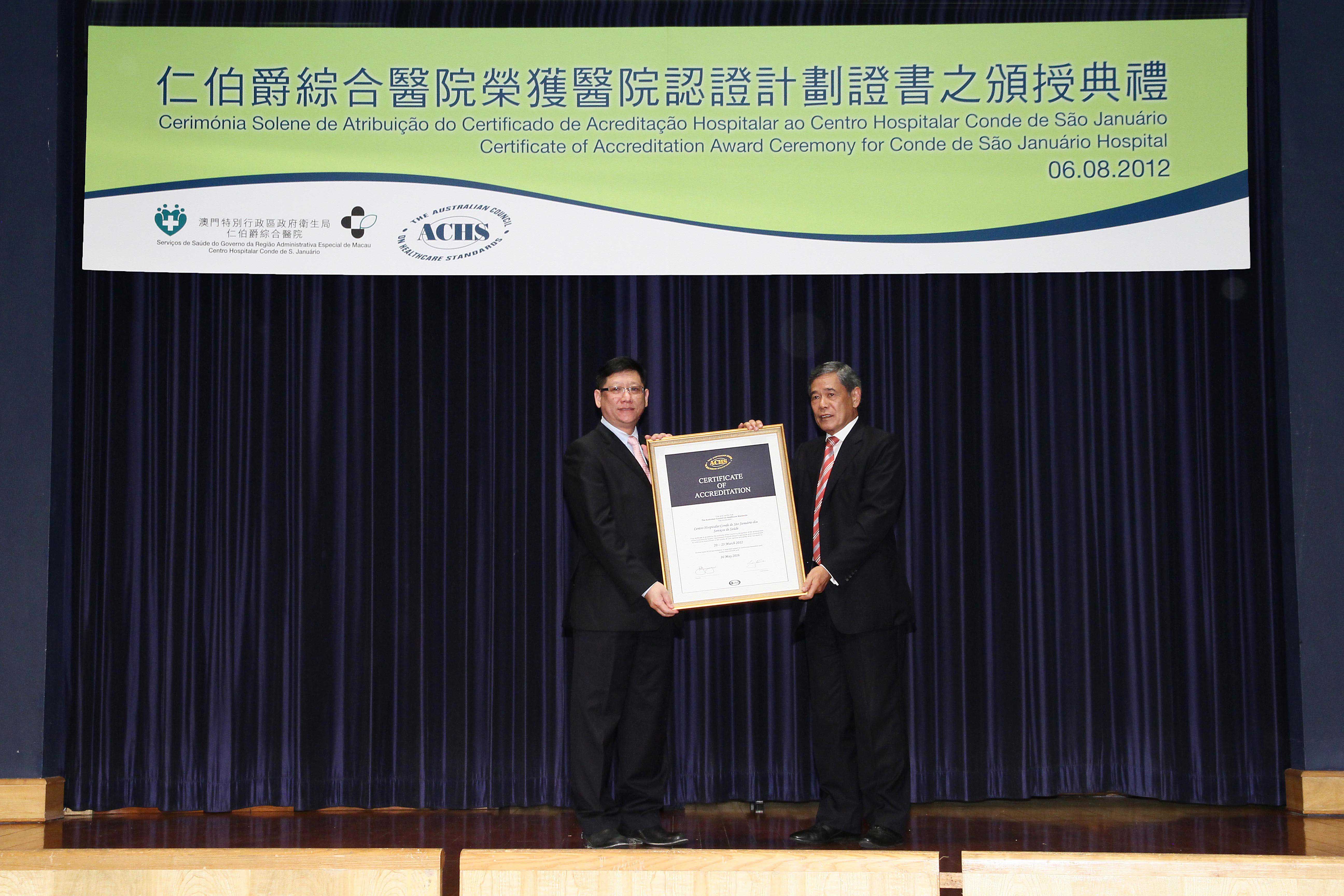 醫院認證是世界性的趨勢,仁伯爵綜合醫院是本澳首間獲澳洲醫療服務標準委員會認證的醫院,衛生局希望透過該認證工作,從而推動醫院前線和後勤部門不斷強化溝通和跨部門的相互支援,發揮各部門的團隊合作精神,以便持續不斷地優化醫院服務,提昇醫療服務的質素、效率和安全性,進一步增強市民對本澳醫療服務的信心。