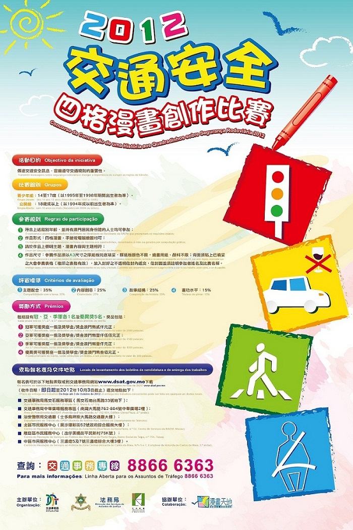 由交通事務局、治安警察局、法務局及民政總署主辦,漫畫天地工作室協辦的“交通安全四格漫畫創作比賽"明(7日)起接受報名。有興趣參與的人士可前往交通事務局馬交石和中華廣場的服務專區、治安警察局交通廳、民政總署北區、中區或離島的巿民服務中心索取報名表格,或登入交通事務局網站www.dsat.gov.mo下載,並於10月3日前連同參賽作品交回上述地點。優勝者可獲得獎座及澳門幣300至2,000元獎金不等。
