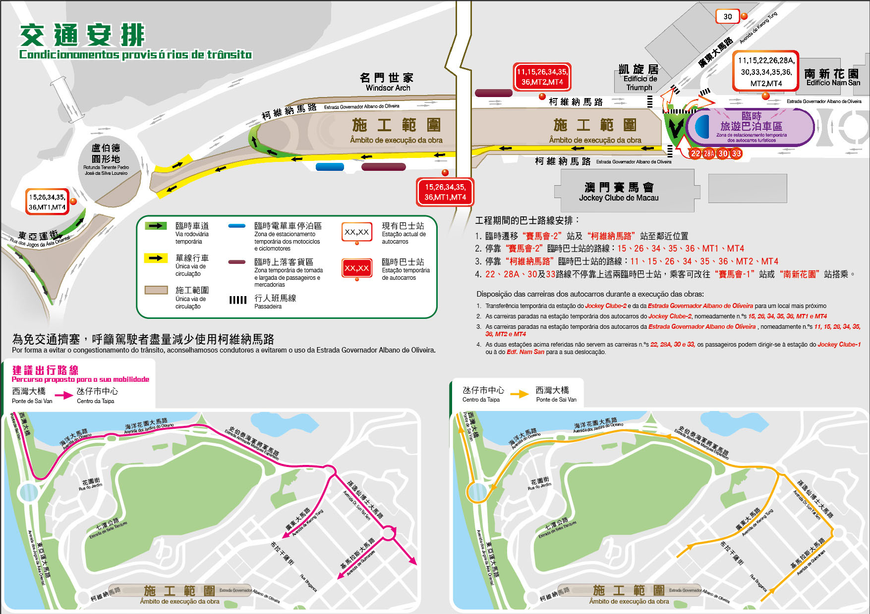 為減低工程對市民及周邊交通的影響,施工期間,交通事務局將臨時遷移“賽馬會-2”及“柯維納馬路”站,在距離上述兩巴士站約200米設置臨時巴士站,方便乘客上落車。同時,因應近賽馬會的一段柯維納馬路將逐步收窄至單線行車,為減少該處交通壓力,22、28A、30及33路線,在停靠“賽馬會-1”站後,改途經柯維納馬路(近賽馬會)新增設的臨時車道往廣東大馬路或柯維納馬路(近南新花園)繼續按原線行駛,期間暫不停靠“賽馬會-2”及“柯維納馬路”兩臨時巴士站。另外,隨著上述巴士路線調整,預計使用“南新花園”站候車的市民會增多,因此,交通事務局將適當擴大該巴士站範圍,盡量縮短市民候車及上落車的時間。